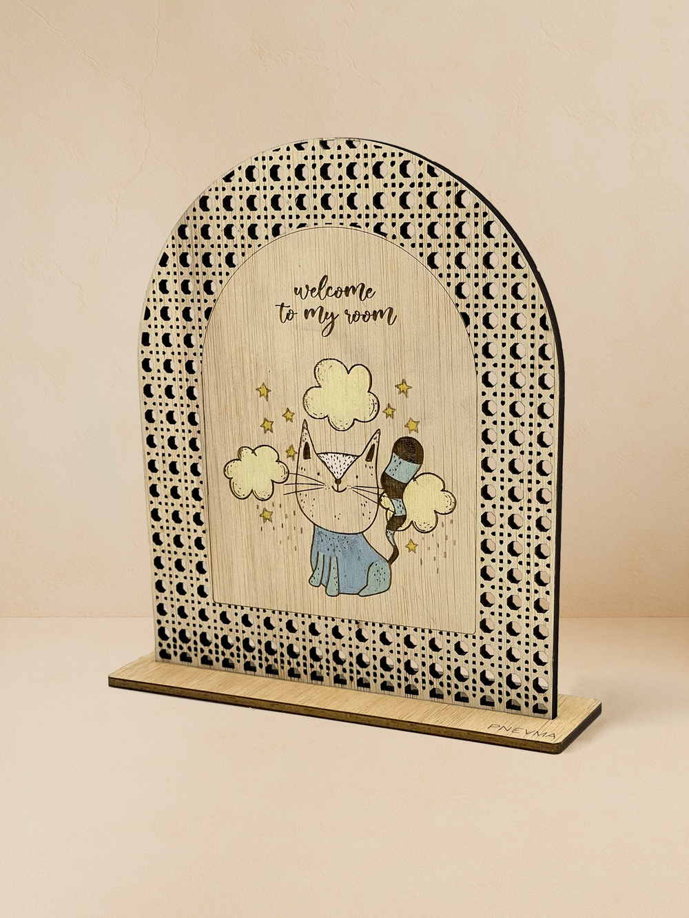 Ξύλινο διακοσμητικό από ilomba με διάτρητο μοτίβο rattan. Στο κέντρο, καθρέπτης χρυσός, ροζ χρυσός, ασημί χαράσσεται η γατούλα με σύννεφα και αστέρια και τη φράση “welcome to my room”. Μίνιμαλ, χαρούμενο στοιχείο για παιδικό δωμάτιο, χειροποίητο στην Pnevma και έτοιμο σε πολυτελή συσκευασία.