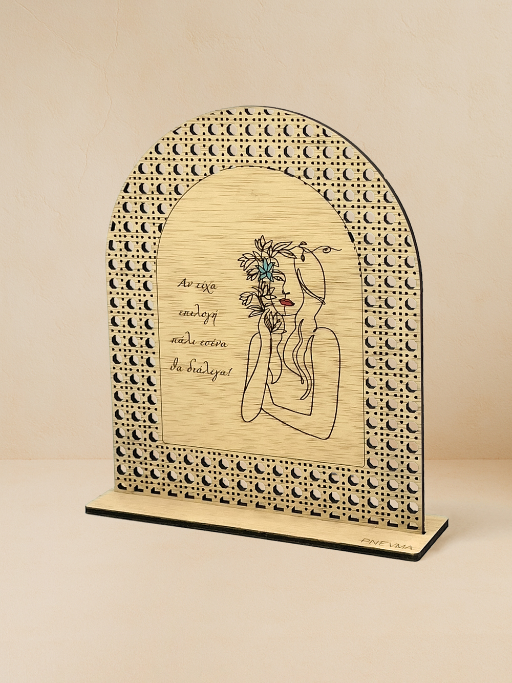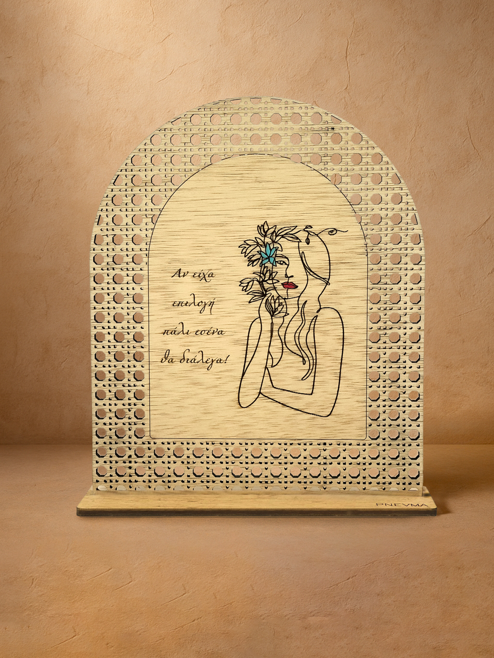 Αν είχα κάθε λουλούδι για τις φορές που σε σκέφτομαι, ο κήπος μου θα ήταν ατελείωτος, κι όμως, πάλι εσένα θα διάλεγα. Το rattan διακοσμητικό «Πάλι Εσένα Θα Διάλεγα» ζωγραφίζει αυτήν τη σκέψη σε φυσικό ξύλο ilomba, κομμένο με laser σε περίτεχνο μοτίβο. Η φιγούρα γυναίκας με πολύχρωμο άνθος συναντά τη χειρόγραφη φράση, χαρίζοντας μίνιμαλ πολυτέλεια και ρομαντισμό σε κάθε χώρο. Χειροποίητο από το Pnevma, γίνεται εκλεπτυσμένο δώρο αγάπης ή statement αυτοέκφρασης για όποιον πιστεύει στην επιλογή της καρδιάς.