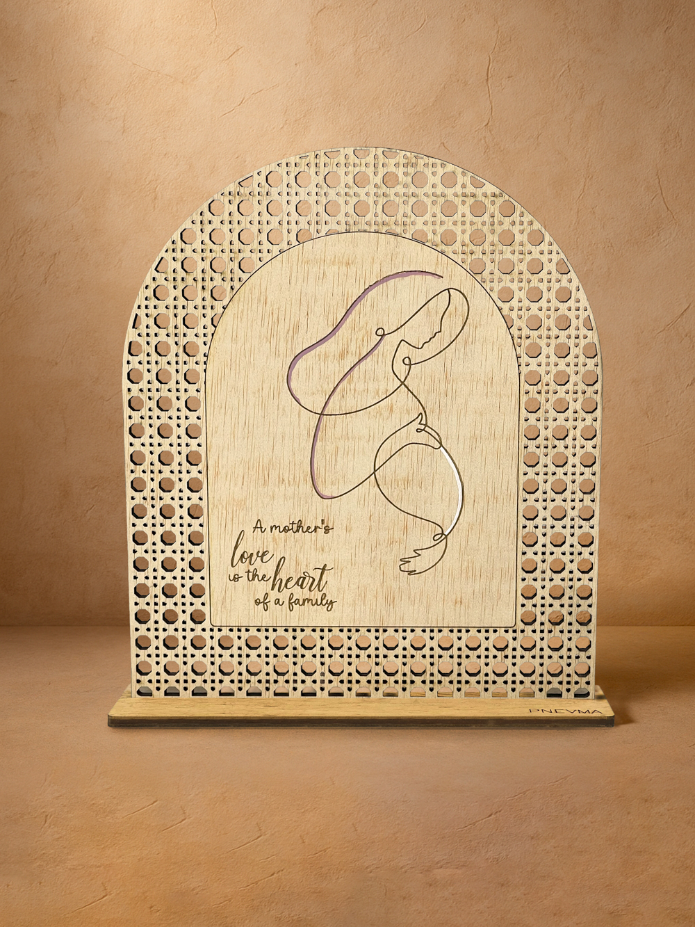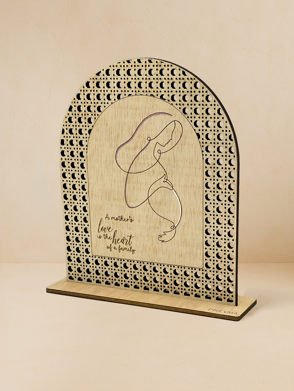 Η καρδιά μιας οικογένειας χτυπά στον ρυθμό της μητρικής αγάπης. Στο «Μητρική αγάπη», το φίνο rattan ξύλο ilomba χαράσσεται με τη φράση «A mother’s love is the heart of a family» και την κομψή oneline φιγούρα μητέρας. Μίνιμαλ, συγκινητικό και διαχρονικά κομψό, κατασκευάζεται στο εργαστήριο Pnevma για να τιμήσει τη στοργή της μητέρας που κρατά τα πάντα ενωμένα.