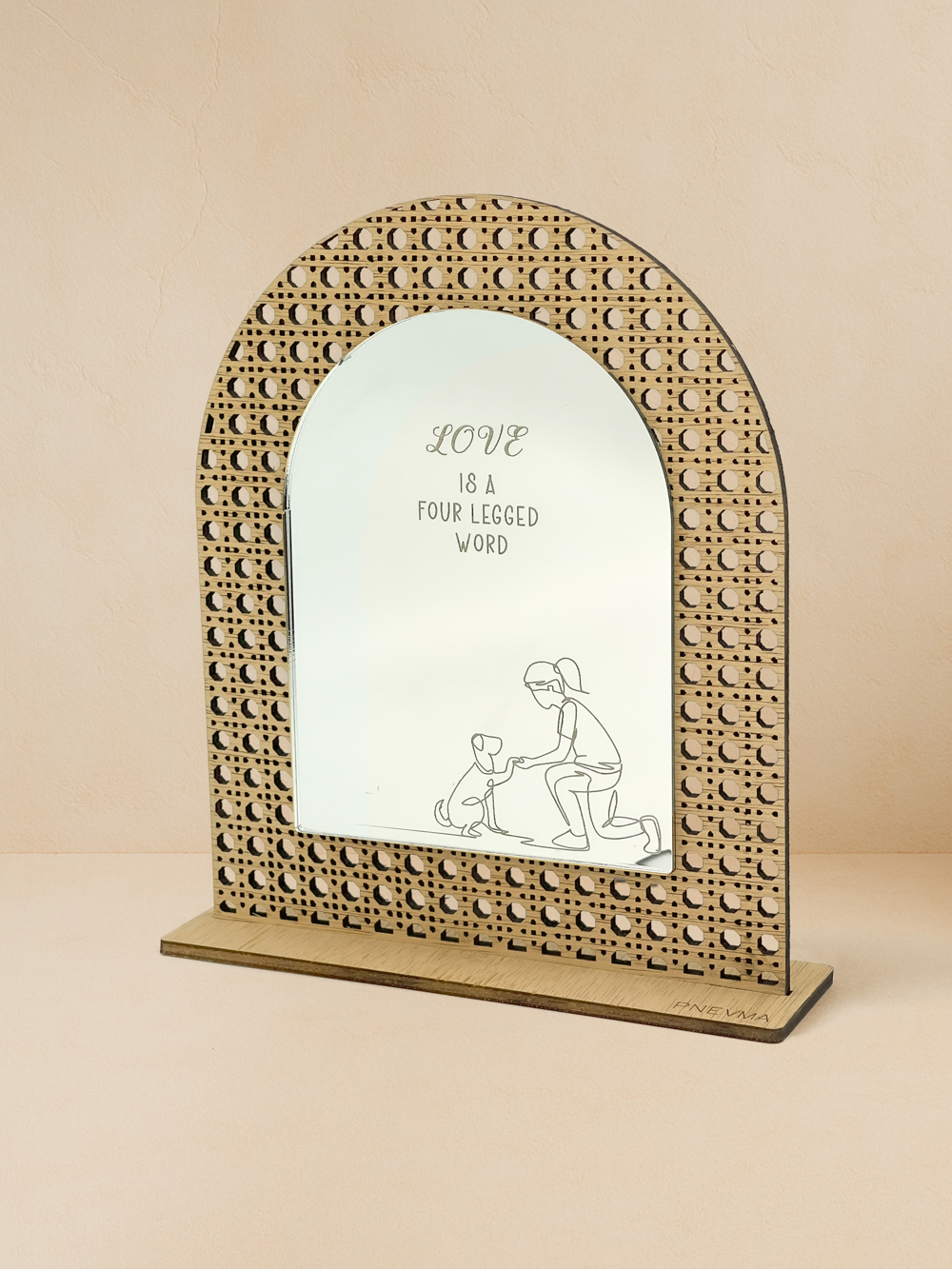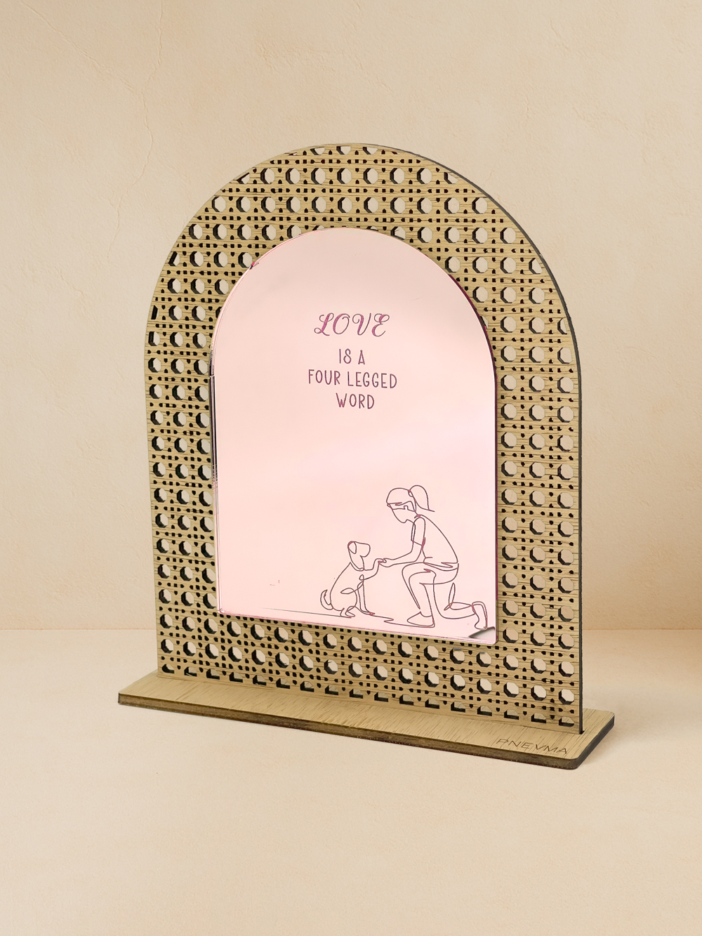 Η αληθινή αγάπη έχει τέσσερα πόδια και ουρά που κουνιέται από χαρά. Το «Τετράποδη Αγάπη» αιχμαλωτίζει τη στιγμή που ένα σκυλάκι ακουμπά την πατούσα του στο χέρι του ανθρώπου του, χαραγμένη σε καθρέπτη χρυσό, ροζ χρυσό ή ασημί. Το φίνο μοτίβο rattan σε ξύλο ilomba αγκαλιάζει τη χάραξη, χαρίζοντας διακριτική πολυτέλεια σε κάθε σπίτι όπου τα πατουσάκια αφήνουν ανεξίτηλο αποτύπωμα. Χειροποίητο με φροντίδα στο εργαστήριο Pnevma, φτιαγμένο να τιμά τον πιο πιστό φίλο.