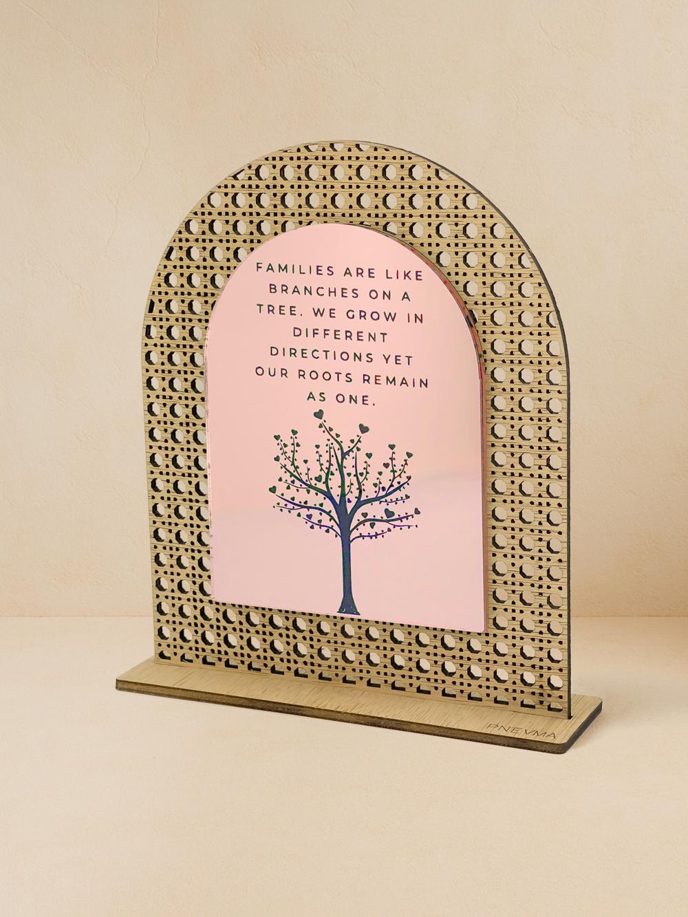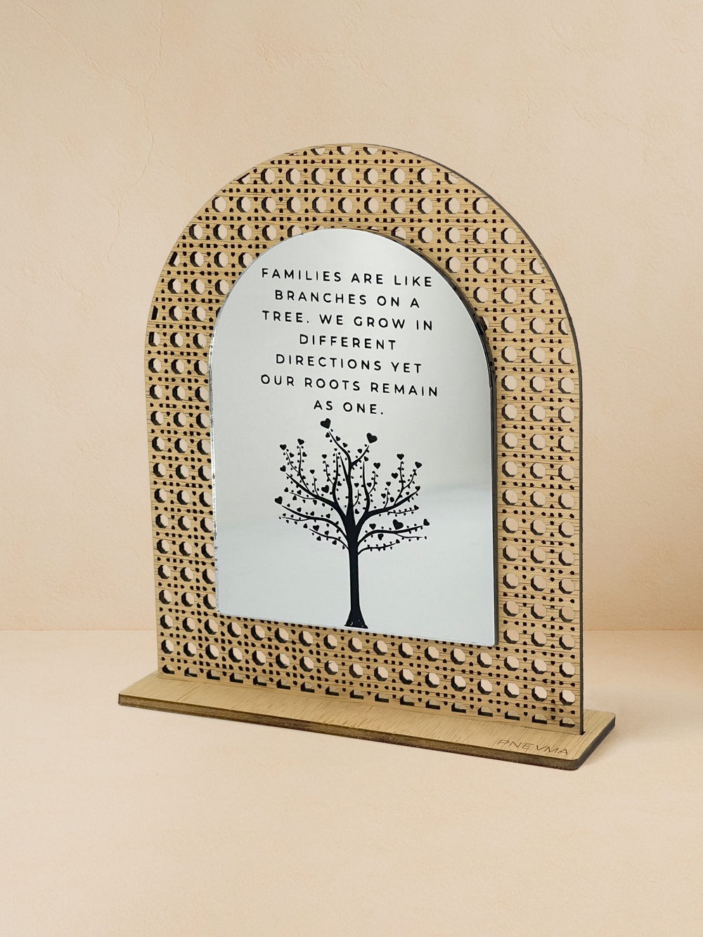Οι ρίζες μας μάς κρατούν ενωμένους, όσο κι αν απλωθούν τα κλαδιά. Στο rattan διακοσμητικό «Δέντρο Οικογένειας», χαράσσεται η φράση «Families are like branches on a tree…». Το φυσικό ξύλο ilomba, κομμένο με laser σε φίνο μοτίβο rattan, σε συνδυασμό με τον καθρέφτη σε χρυσό, ροζ χρυσό ή ασημί χρώμα, δημιουργεί μια λιτή πολυτέλεια που ζεσταίνει κάθε χώρο. Χειροποίητο, φτιαγμένο αποκλειστικά στο εργαστήριο Pnevma, έρχεται σε προσεγμένη συσκευασία, έτοιμο να θυμίζει καθημερινά πως, όπου κι αν μας οδηγεί η ζωή, η αφετηρία της καρδιάς μας παραμένει η ίδια.