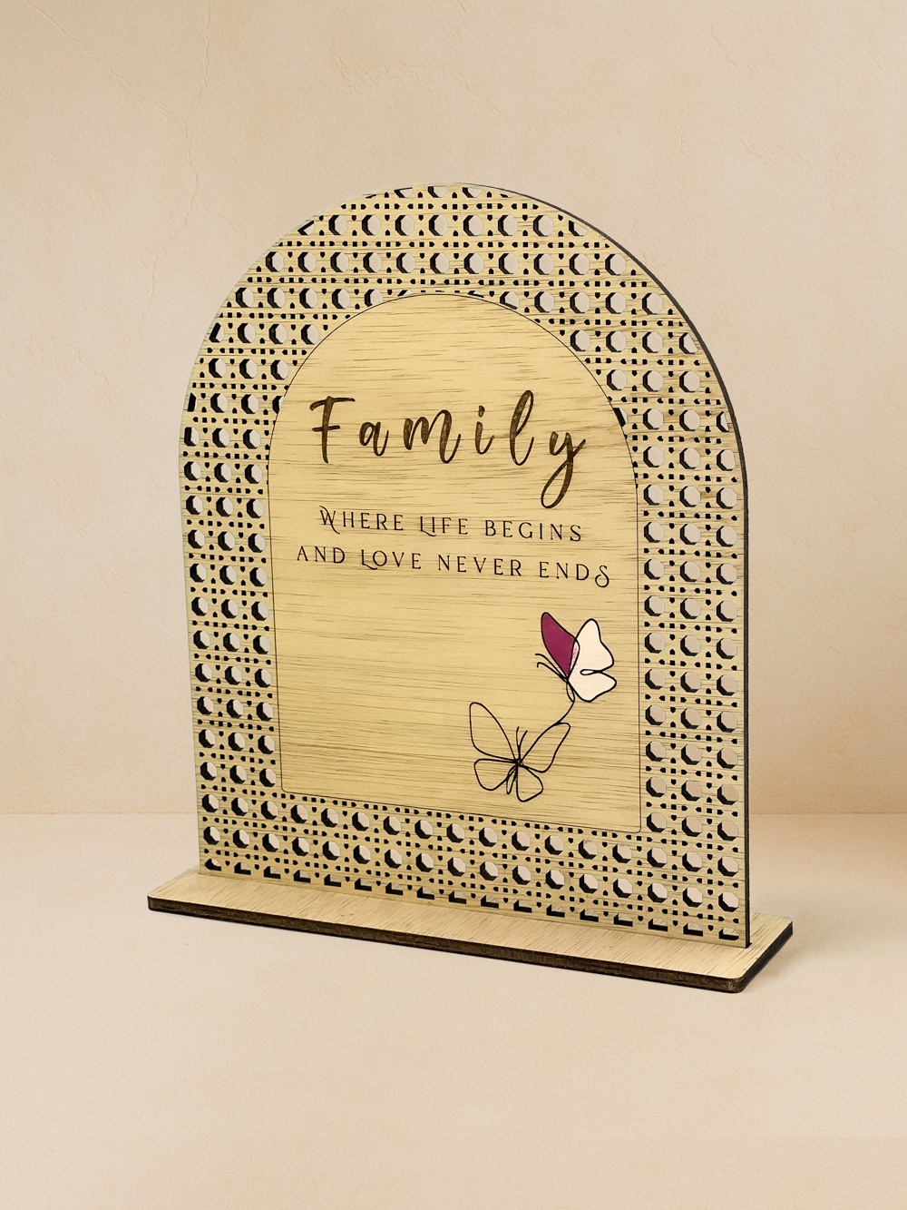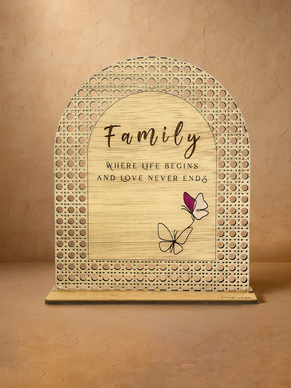 Εκεί όπου η ζωή ξεκινά και η αγάπη δεν τελειώνει ποτέ. Αυτό σημαίνει οικογένεια. Το «Οικογένεια & Αγάπη» ενώνει το ζεστό ξύλο ilomba, κομμένο με laser, με το λεπτεπίλεπτο μοτίβο rattan. Η φράση «Family, where life begins and love never ends» και το δίχρωμο σχέδιο πεταλούδας γίνονται φωτεινή υπενθύμιση τρυφερότητας για κάθε σπίτι. Χειροποίητη δημιουργία Pnevma που προσθέτει μίνιμαλ πολυτέλεια και συναισθηματική αξία για ράφι ή γραφείο.