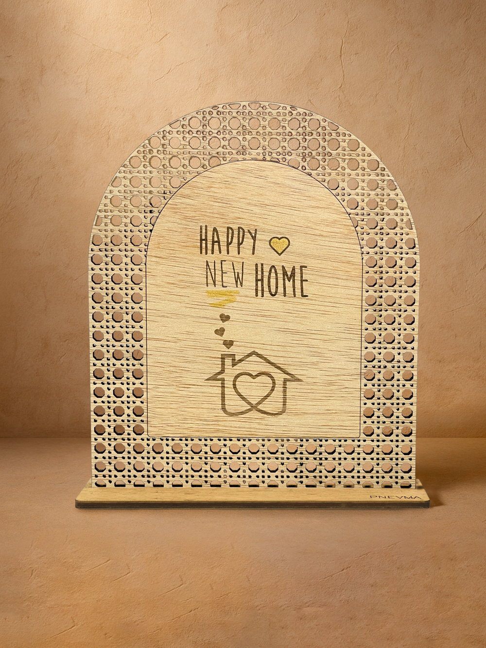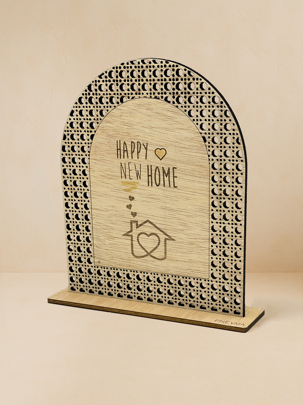Κάθε νέο σπίτι αξίζει μια πινελιά καρδιάς. Στο rattan διακοσμητικό «Happy New Home» το φυσικό ξύλο ilomba, κομμένο με laser σε κομψό μοτίβο, όπου χαράζεται η ευχή και το μίνιμαλ σπιτάκι καρδιά. Η ζεστή υφή συναντά μεταλλική λάμψη, δημιουργώντας μίνιμαλ statement που χαρίζει θαλπωρή σε ράφι ή είσοδο. Χειροποίητο στο εργαστήριο Pnevma, καταφθάνει σε πολυτελή συσκευασία, έτοιμο να σηματοδοτήσει μια καινούργια αρχή με διακριτική πολυτέλεια.