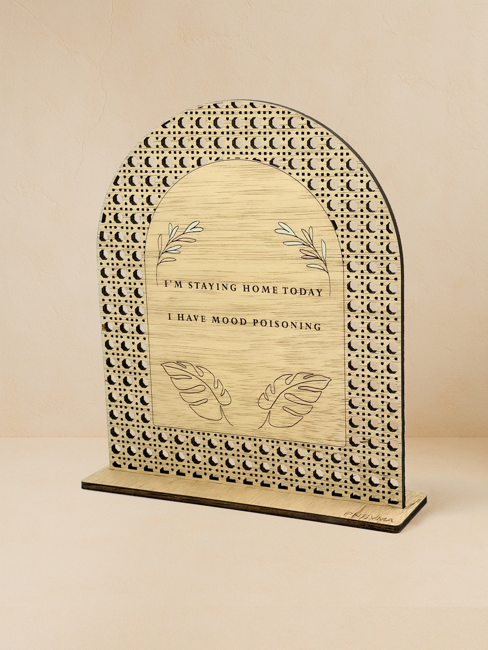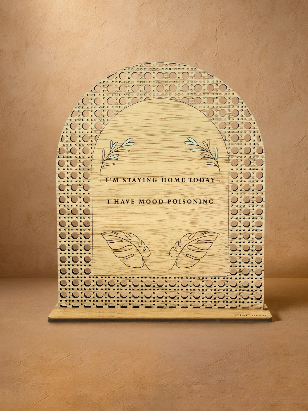 Κάποιες μέρες η πολυτέλεια κρύβεται στη γαλήνη του σπιτιού. Το rattan διακοσμητικό «Σπιτική Γαλήνη» μετατρέπει αυτή τη διάθεση σε τέχνη: ζεστό ξύλο ilomba, κομμένο με laser σε φίνο μοτίβο, πλαισιώνει καθρέπτη χρυσό, ροζ χρυσό ή ασημί όπου χαράσσεται η χιουμοριστική φράση «Σήμερα μένω σπίτι, έχω τοξική διάθεση», αγκαλιασμένη από διακριτικά σχέδια μονστέρα. Η φυσική υφή του ξύλου, χαρίζει μίνιμαλ κομψότητα σε γραφείο ή κομοδίνο. Χειροποίητο από το εργαστήριο Pnevma, για να γίνει δώρο αυτοφροντίδας ή κομψή υπενθύμιση ότι η ξεκούραση είναι δικαίωμα.