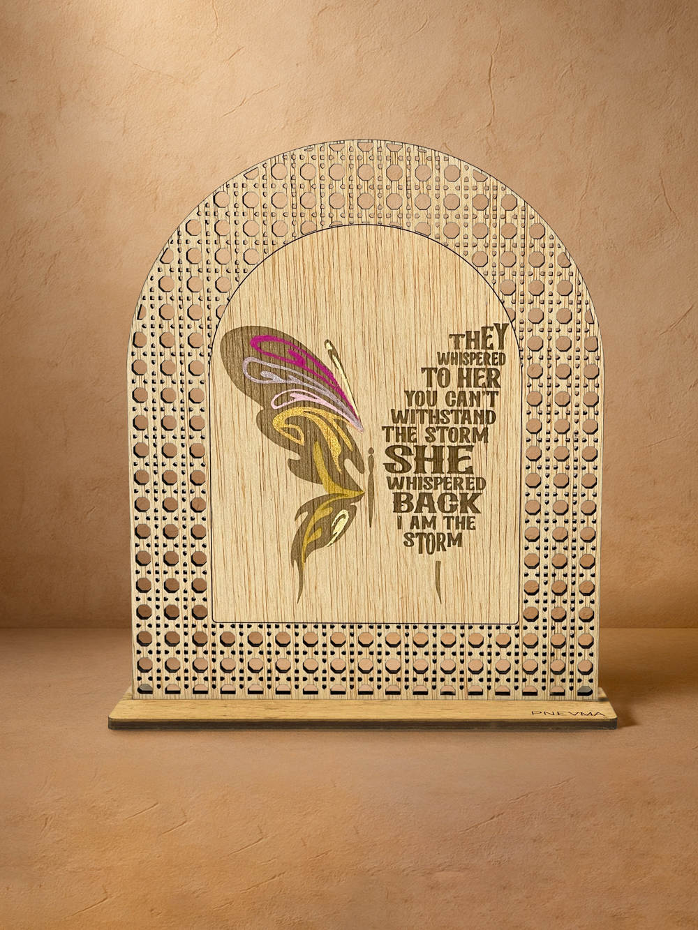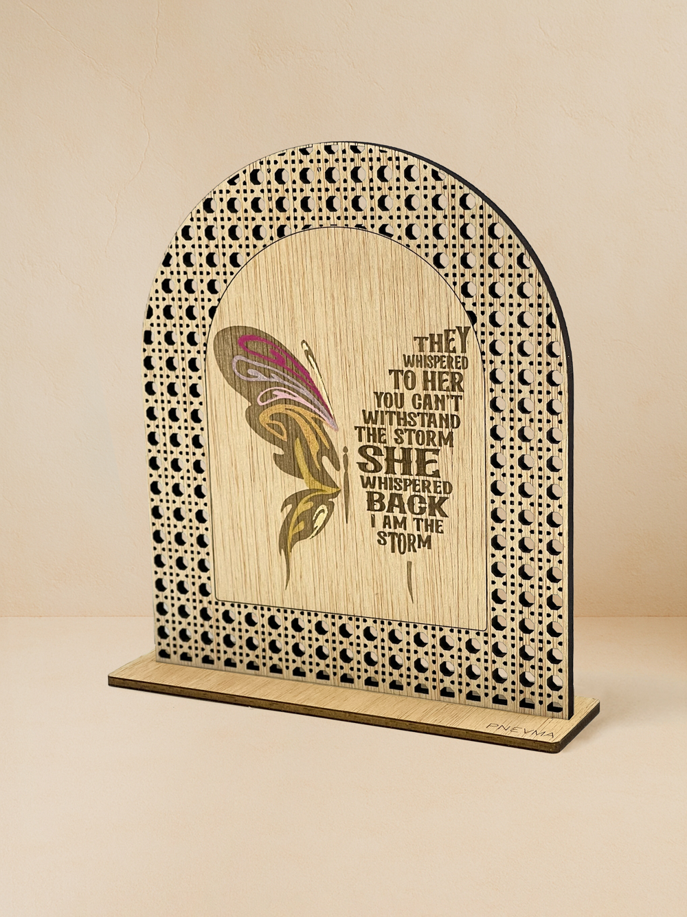 «Δεν αντέχεις την καταιγίδα», της είπαν· «Εγώ είμαι η καταιγίδα», απάντησε. Η φράση-μανιφέστο σχηματίζει το περίγραμμα μιας πολύχρωμης πεταλούδας, χαραγμένης με ακρίβεια laser. Το φυσικό ξύλο ilomba, δουλεμένο σε μίνιμαλ μοτίβο rattan, προσθέτει αέρινη υφή και πολυτέλεια low-key. Κομψό και ταυτόχρονα δυναμικό, τοποθετείται σε γραφείο, κομοδίνο ή ράφι ως διαρκής υπενθύμιση ότι η πραγματική ισχύς κρύβεται μέσα μας. Κάθε κομμάτι κατασκευάζεται στο εργαστήριο Pnevma, λειαίνεται στο χέρι και φτάνει σε πολυτελή συσκευασία—έτοιμο να γίνει δώρο ενδυνάμωσης σε εκείνη που μετατρέπει τους ψιθύρους σε θύελλα.