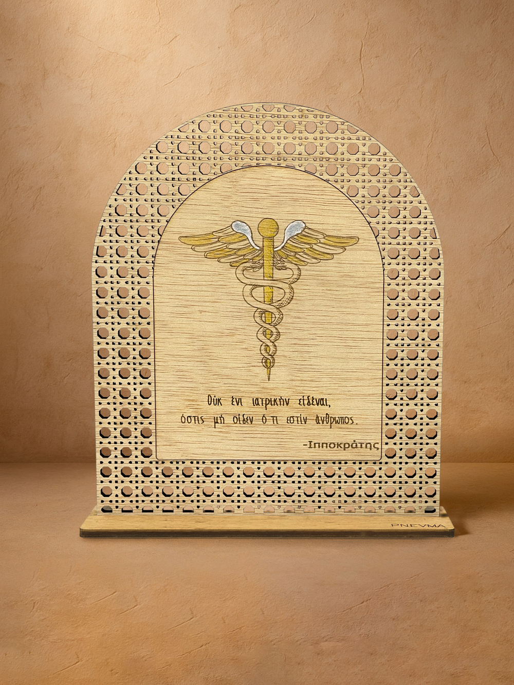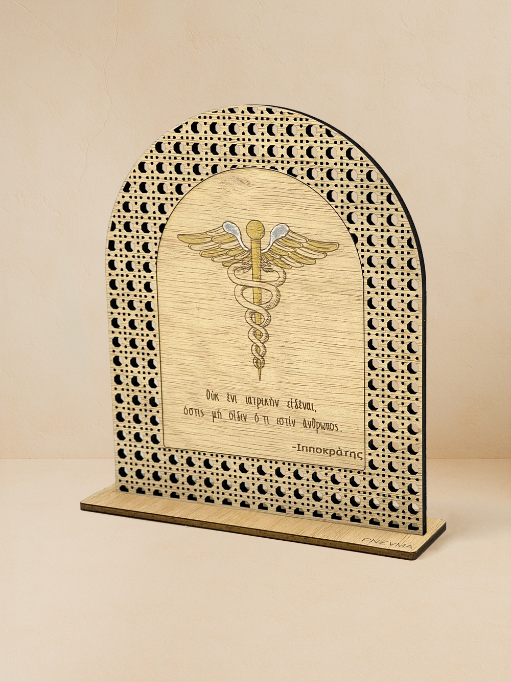 Αφιέρωσε ένα κομψό αντίδωρο στον άνθρωπο που υπηρετεί την επιστήμη της ζωής. Στο «Ιπποκράτειο Ρητό» ο κηρύκειον, διαχρονικό σύμβολο της Ιατρικής, χαράζεται λεπτομερώς, ενώ από κάτω δεσπόζει η φράση του Ιπποκράτη «Ουκ εν ιατρικην εἰδέναι, ὅστις μὴ οἶδεν ὅτι ἐστὶν ἄνθρωπος». Το διαφανές φως του μετάλλου αντανακλάται στο lasercut μοτίβο rattan από φυσικό ξύλο ilomba, χαρίζοντας μίνιμαλ πολυτέλεια σε ιατρείο, γραφείο ή σπίτι. Χειροποίητο αποκλειστικά στο Pnevma και παραδομένο σε πολυτελή συσκευασία, γίνεται το ιδανικό δώρο ορκωμοσίας, αποφοίτησης ή ευγνωμοσύνης σε εκείνον που επιλέγει να θεραπεύει.