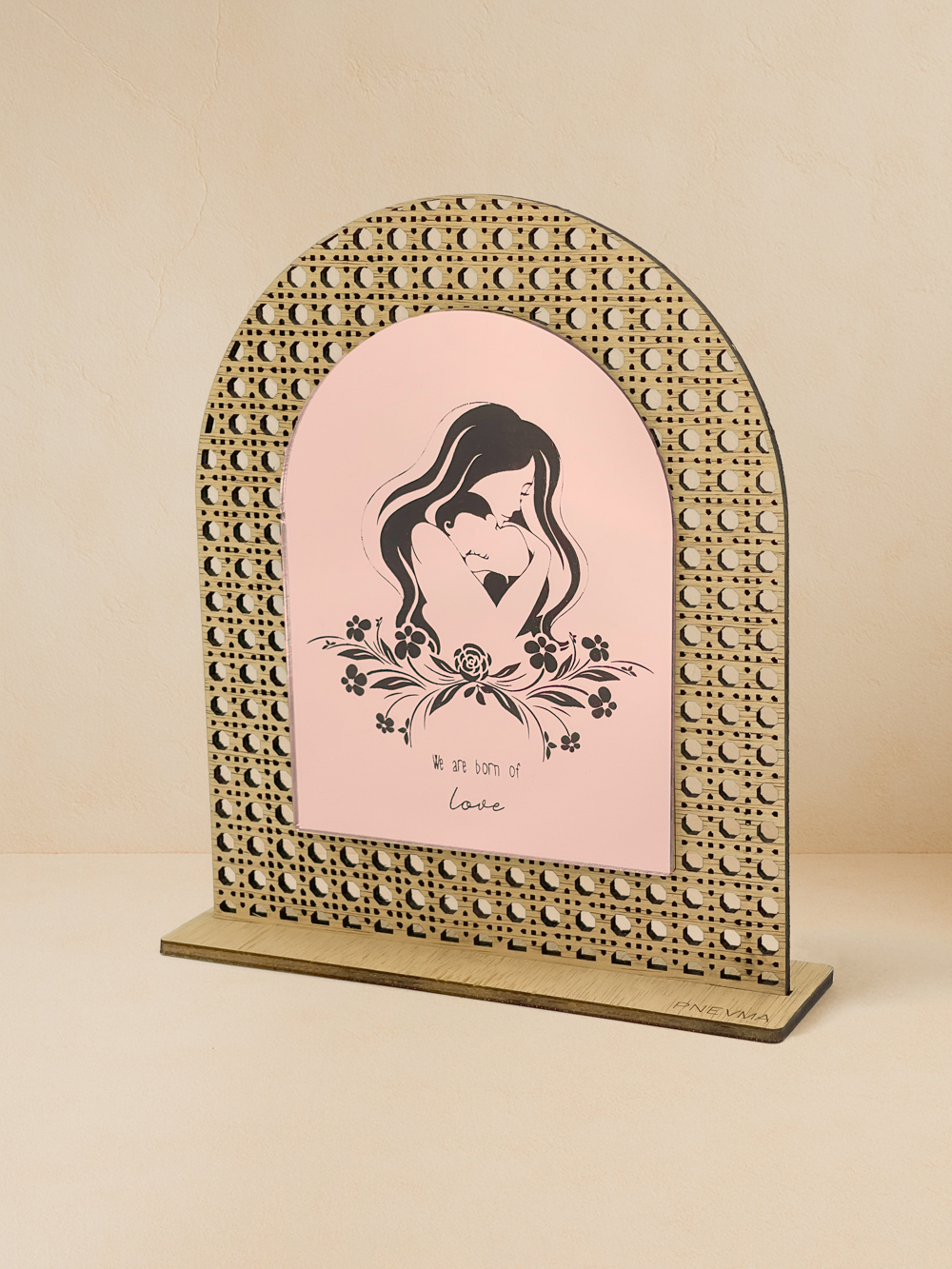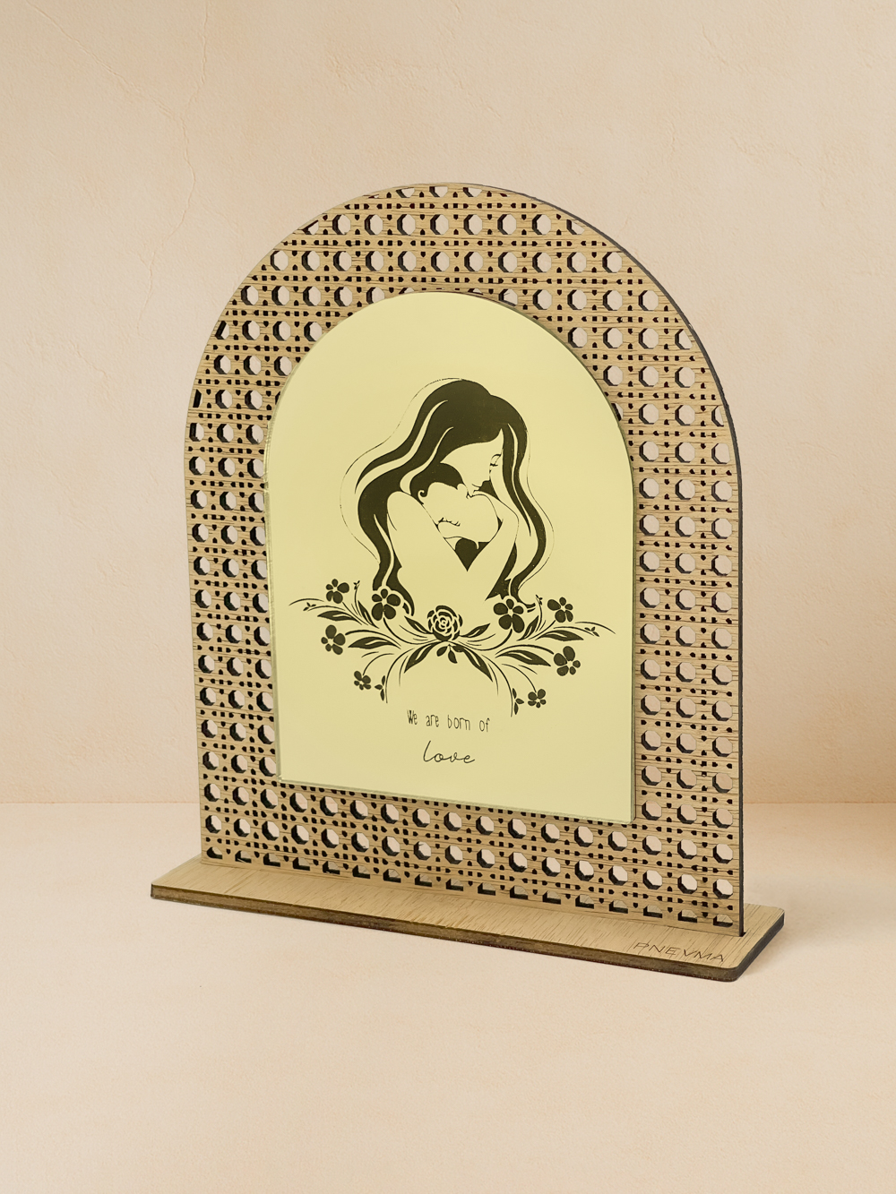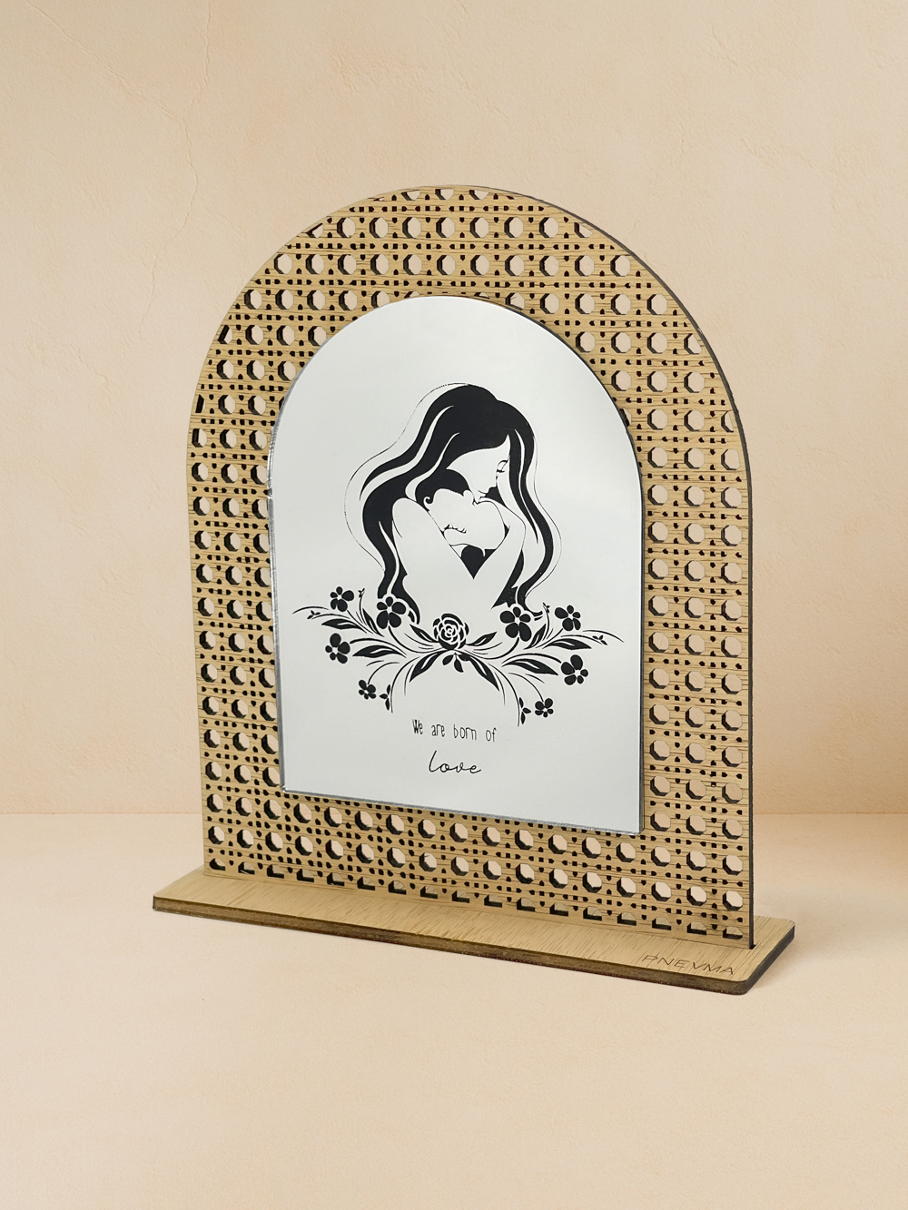 Minimal διακοσμητικό για δώρο μαμάς. Φυσικό ξύλο ilomba με lasercut μοτίβο rattan πλαισιώνει καθρέπτη χρυσό, ροζ χρυσό, ασημί . Στο κέντρο χαράσσεται η φιγούρα μαμάς-καρδιάς, λουλούδια και η φράση «We are born of love». Μικρό, κομψό, χειροποίητο από Pnevma· ιδανικό για ράφι ή γραφείο.