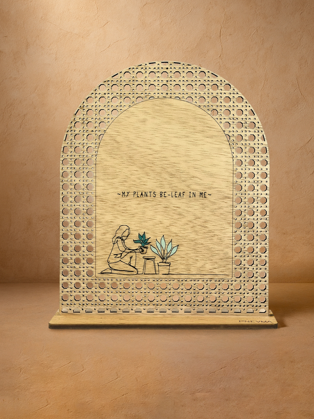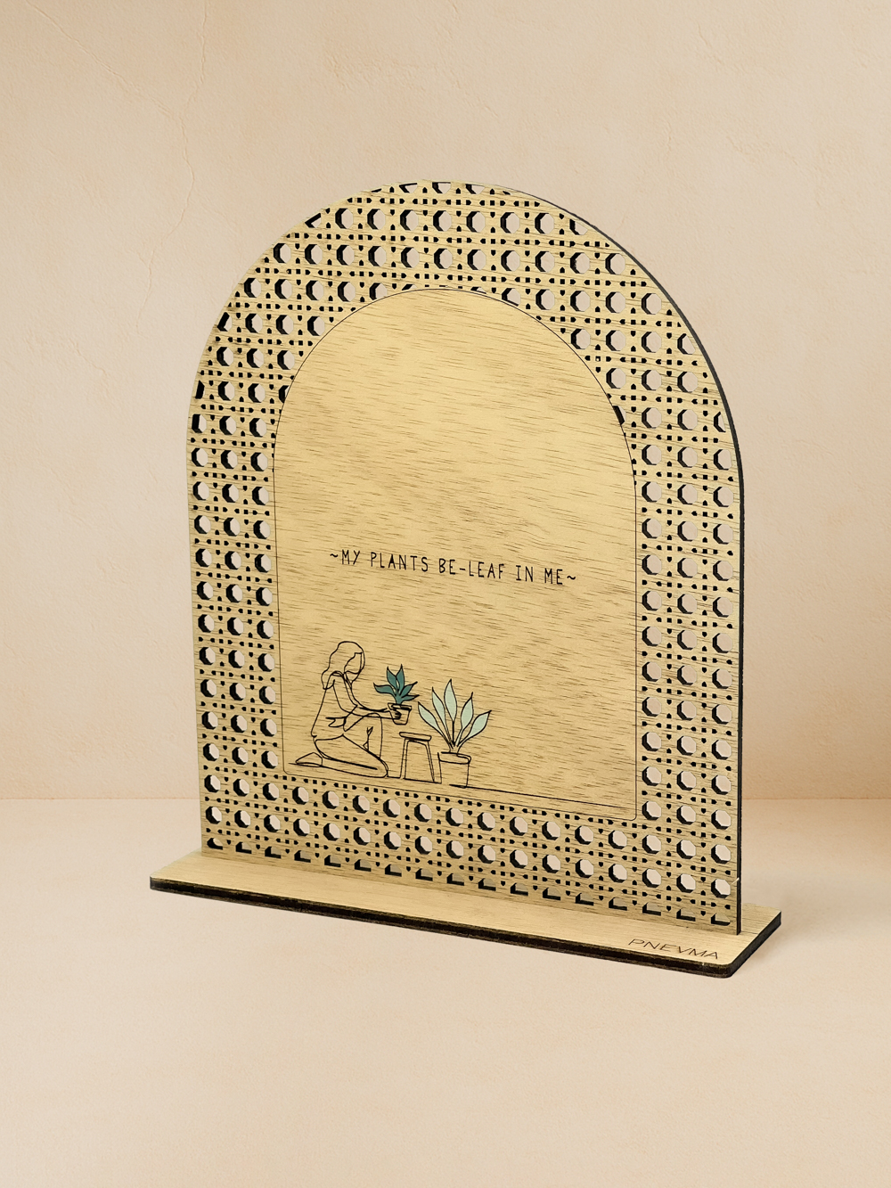 Οι πράσινοι φίλοι σου πιστεύουν σε σένα. Στο «Be‑Leaf in me» μια φιγούρα περιποιείται τις γλάστρες της, ενώ το λογοπαίγνιο θυμίζει πως η φροντίδα επιστρέφεται πάντα. Rattan μοτίβο από ilomba χαρίζουν ανεπιτήδευτη κομψότητα σε κάθε plant corner.