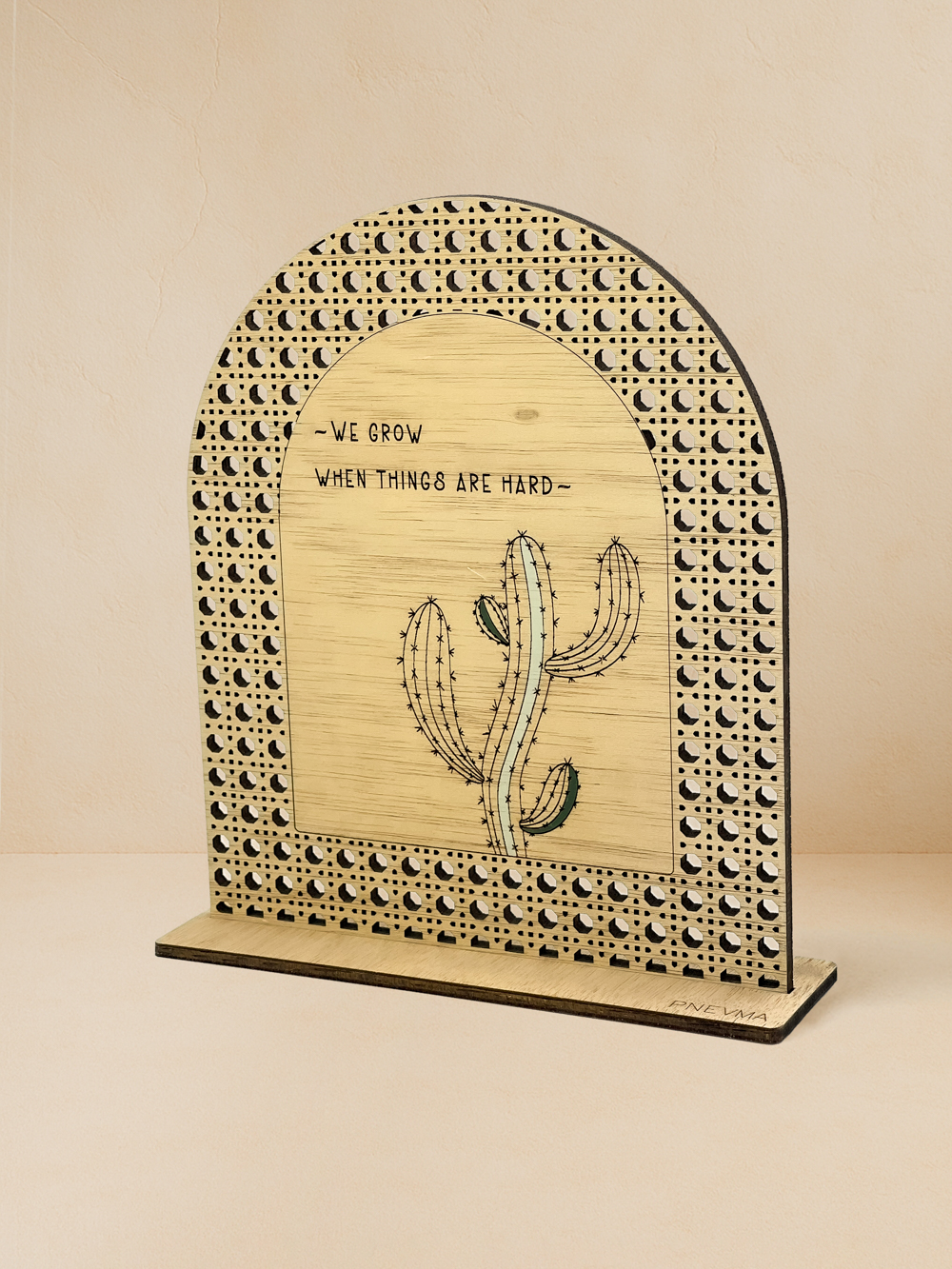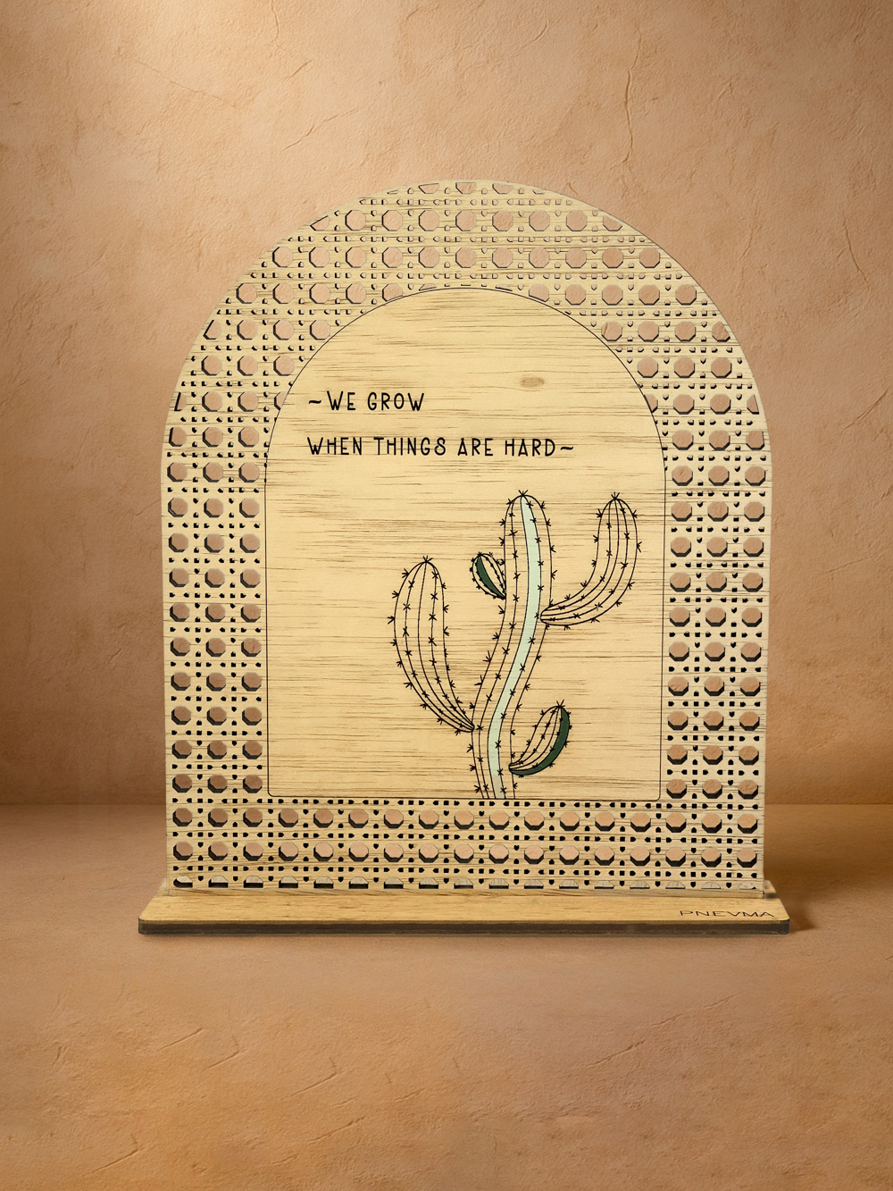 • Ξύλινο επιτραπέζιο διακοσμητικό με μοτίβο rattan και καθρέπτη, χαραγμένο κάκτο και quote «We grow when things are hard».