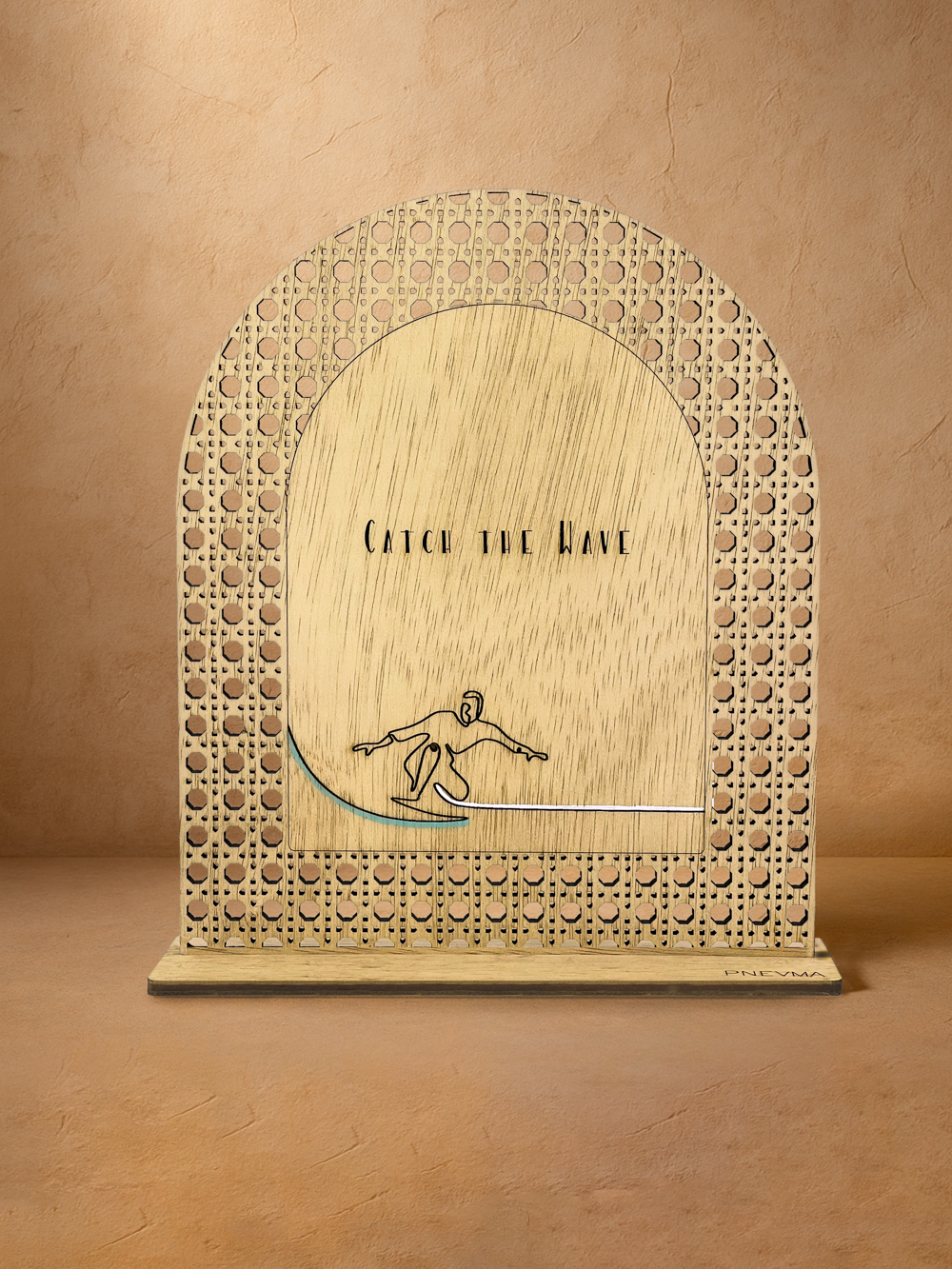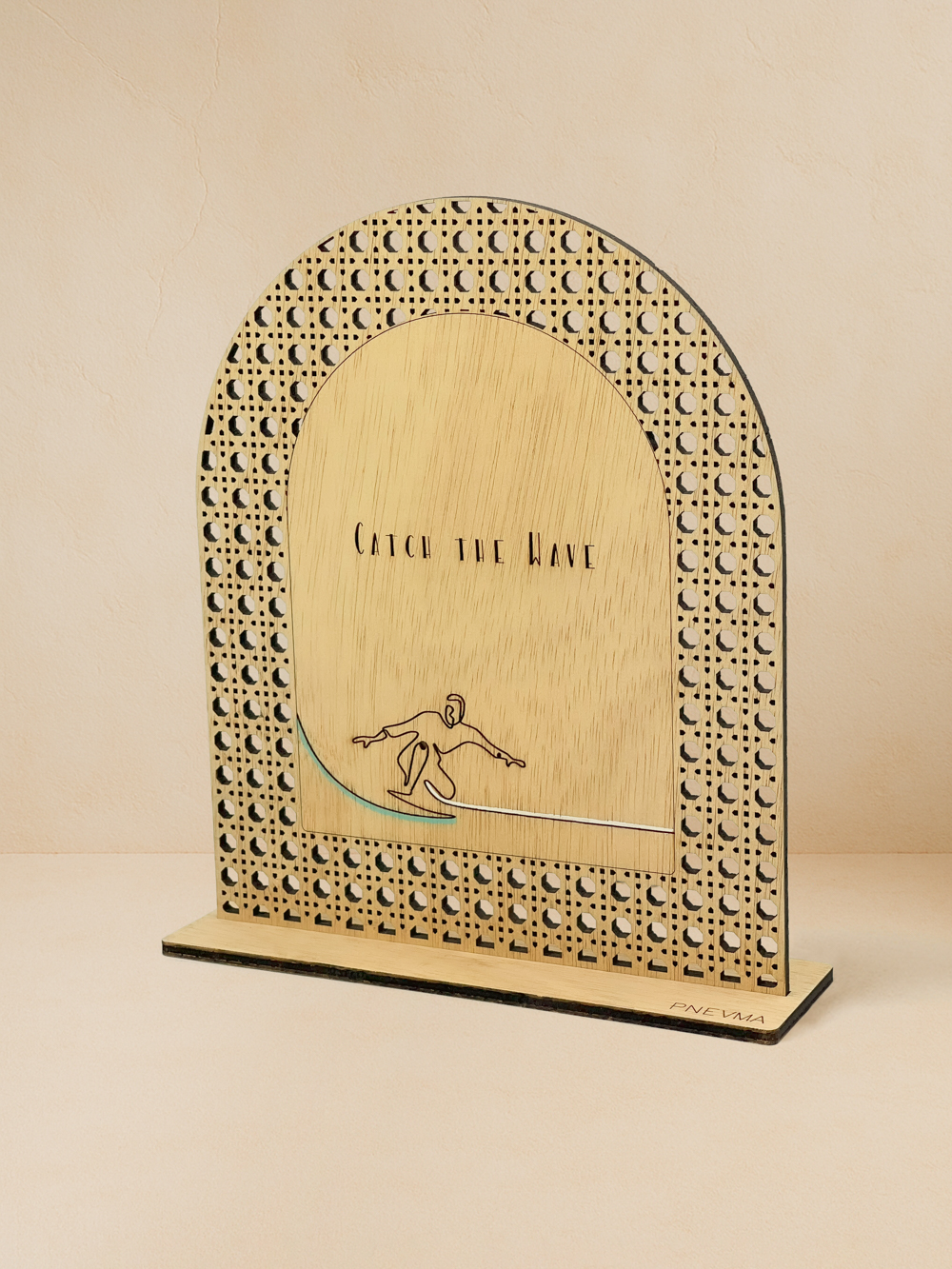Νιώσε τη δροσιά της αλμύρας χωρίς να φύγεις από το γραφείο. Ο surfer του «Catch the Wave» σε καλεί να ανέβεις στο κύμα των ονείρων σου και να κρατήσεις τη φόρα. Φυσικό ilomba, κομμένο με laser σε μοτίβο rattan. Ένα χειροποίητο reminder ότι η περιπέτεια ξεκινά με μία μόνο κίνηση.