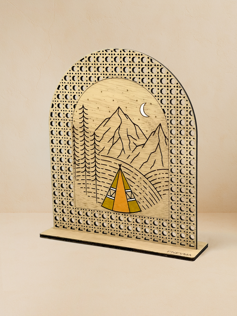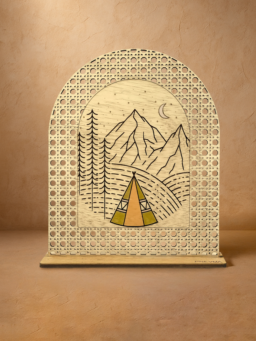 Η κορυφή φαίνεται πιο κοντά όταν τη φέρνεις στο γραφείο σου. Το «Ορεινή Απόδραση» συνδυάζει τη δύναμη του ορεινού τοπίου με τη λεπτότητα του μινιμαλισμού: ξύλο ilomba κομμένο με laser σε μοτίβο rattan πλαισιώνει το εικαστικό όπου χαράσσονται βουνά, έλατα, σκηνή και σελήνη. Φτιαγμένο εξ ολοκλήρου στο Pnevma, λειαίνεται στο χέρι και καταφθάνει έτοιμο να γίνει δώρο‑κάλεσμα προς την περιπέτεια.