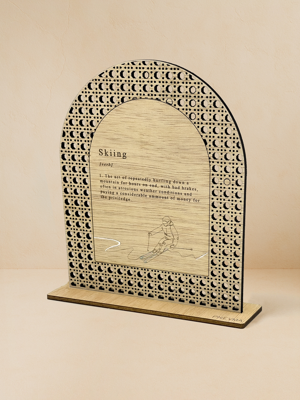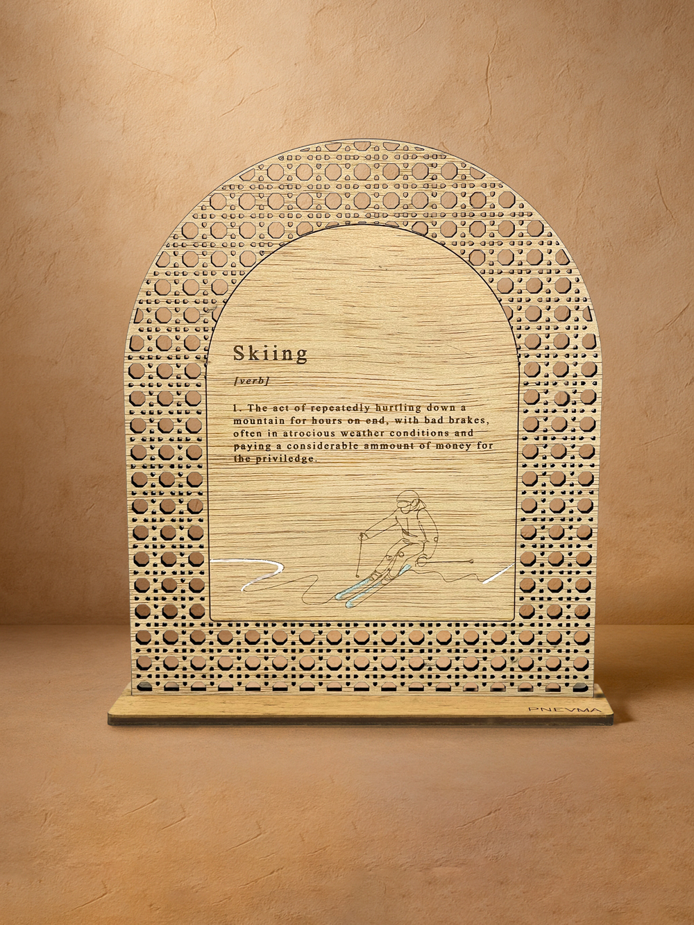 Η αδρεναλίνη του βουνού μεταφράζεται σε ξύλο και μέταλλο: το «Ορισμός Skiing» αιχμαλωτίζει το πάθος για τις πλαγιές με μια μινιμαλ φιγούρα σκιέρ και χιουμοριστικό λεξικό ορισμό. Από φυσικό ilomba, κομμένο laser σε φίνο μοτίβο rattan · η ζεστή υφή συναντά τη μεταλλική λάμψη, δημιουργώντας statement κομψότητας για γραφείο ή σαλέ. Χειροποίητο στο εργαστήριο Pnevma, φτάνει σε πολυτελή συσκευασία, έτοιμο να θυμίζει καθημερινά πως η χαρά του χιονιού αξίζει κάθε κατεβασιά.