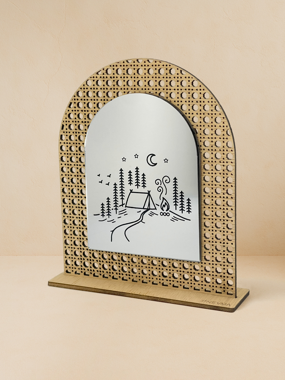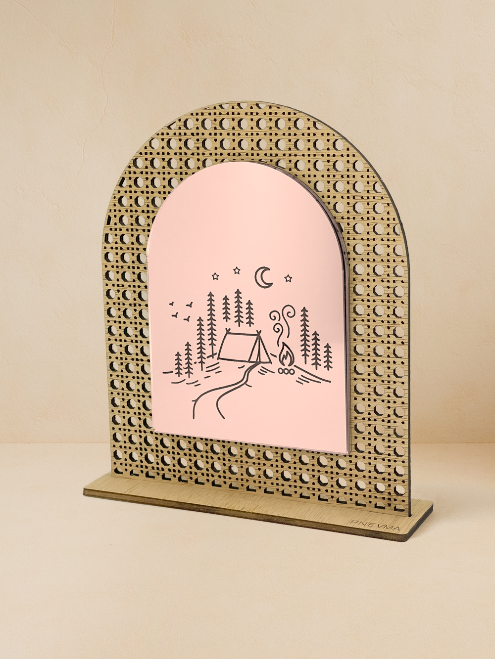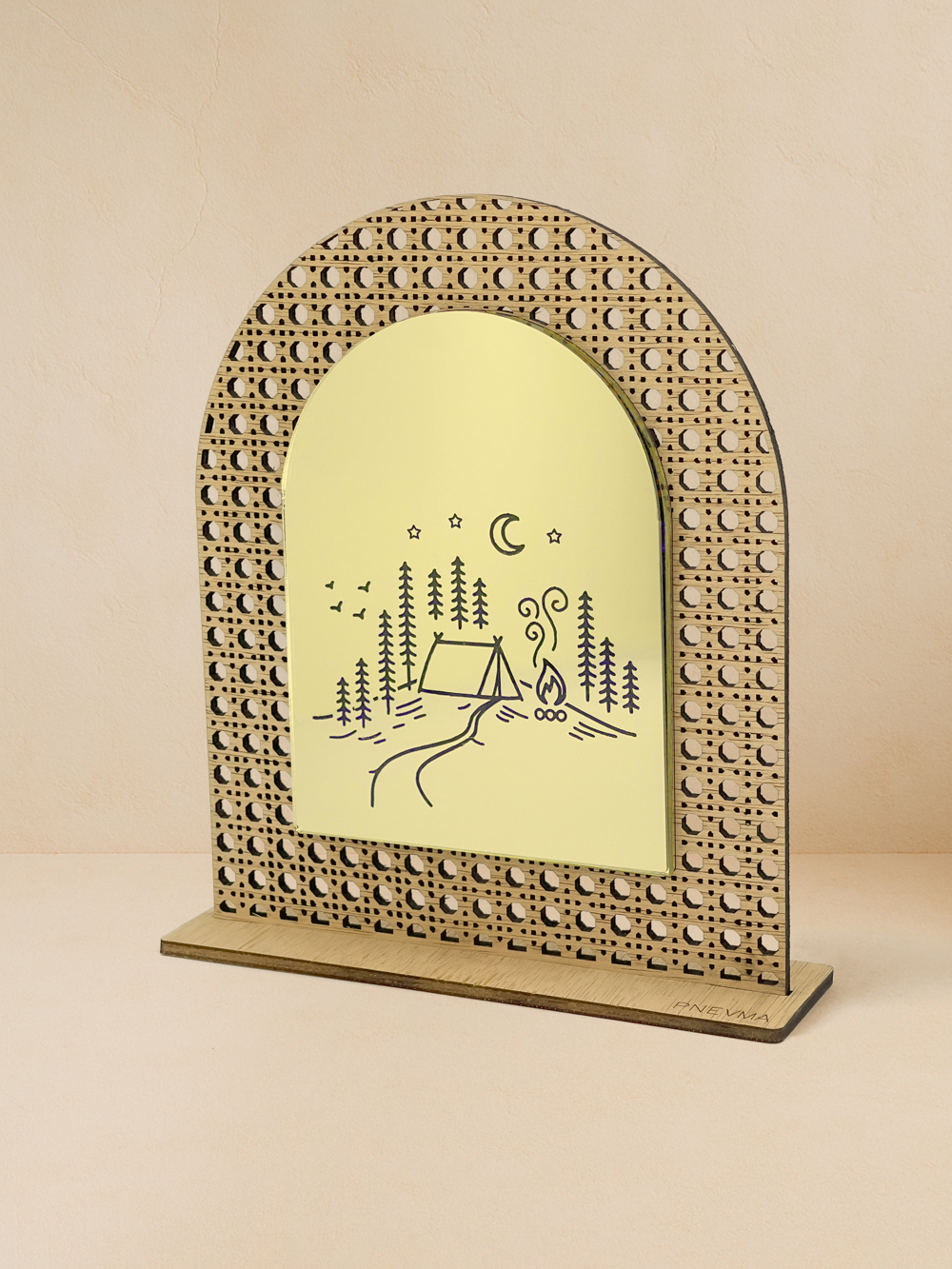 Το άρωμα των πεύκων και το τρεμόπαιγμα της φωτιάς γεμίζουν τον χώρο σου χωρίς να φύγεις από το σαλόνι. Στο «Βραδινό Κάμπινγκ», ξύλο ilomba κομμένο με laser σε λεπτοδουλεμένο μοτίβο rattan αγκαλιάζει τον καθρέπτη σε χρυσό, ροζ χρυσό ή ασημί. Πάνω του ξεδιπλώνεται με μινιμαλιστικές γραμμές η σκηνή, τα έλατα,η σελήνη και οι σπινθήρες της φλόγας, ζωντανεύοντας τη γοητεία της νύχτας στο δάσος. Η φυσική υφή αλληλεπιδρά με τη μεταλλική επιφάνεια, δημιουργώντας ήρεμο contrast που καλεί σε απόδραση. Χειροποίητο στο Pnevma, φέρνει ταξιδιάρικο πνεύμα σε ράφι ή τροχόσπιτο, θυμίζοντάς σου ότι η περιπέτεια βρίσκεται πάντα ένα βήμα μακριά.