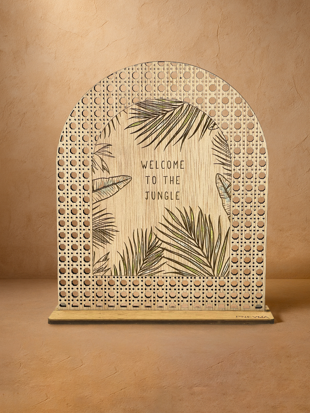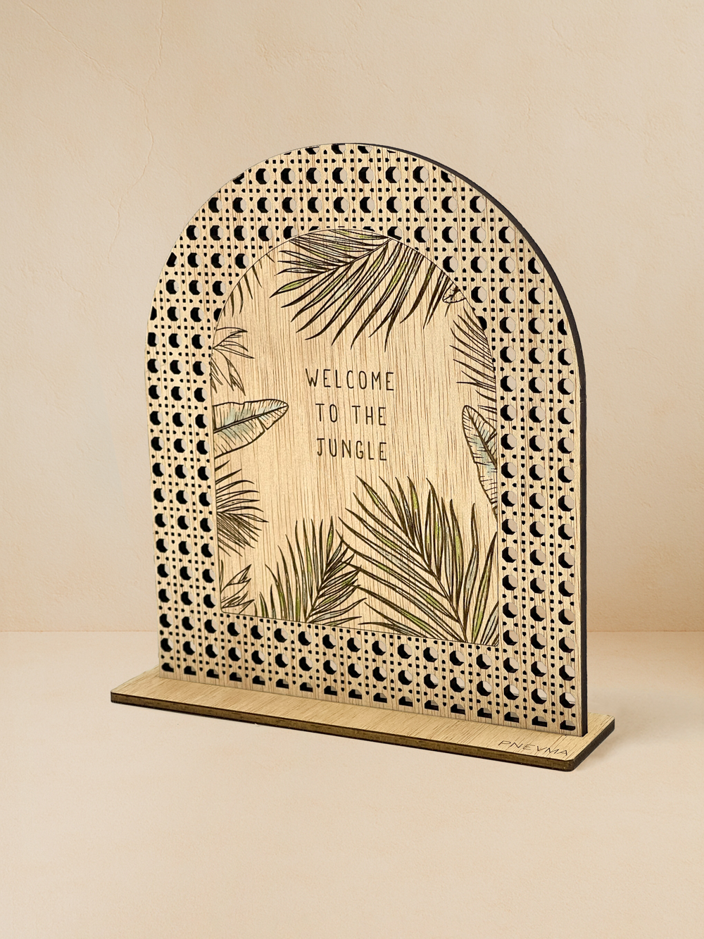 Άφησε τη ζούγκλα να τρυπώσει στο σαλόνι σου. Φύλλα φοίνικα στροβιλίζονται πάνω σε Αφρικάνικο ξύλο ilomba μέσα σε πλαίσιο rattan. Το «Welcome to the Jungle» φέρνει εξωτικό vibe και περιπετειώδη διάθεση στον χώρο.