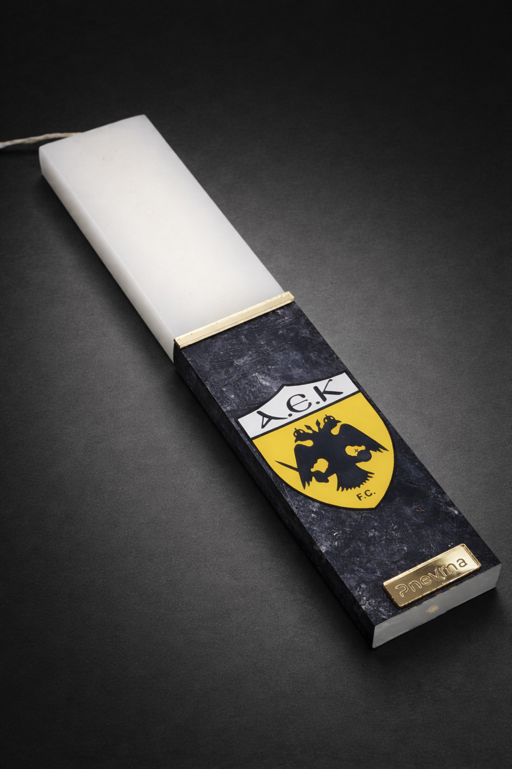 Σκούρα, minimal βάση με κεντρικό έμβλημα | εκτυπωμένη λαμπάδα 25×4.5 cm με καθαρή παρουσία και κιτρινόμαυρο χαρακτήρα. Ένα πασχαλινό δώρο διακριτικό αλλά ξεκάθαρο, ιδανικό για συλλεκτικό ύφος.