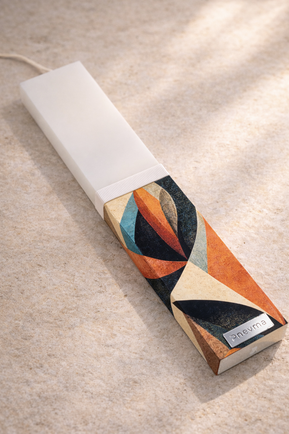 Οργανικές καμπύλες με γήινη παλέτα. Λαμπάδα 25×4.5 cm με εκτύπωση Γαία σε teal και terracotta, με αφαιρετικές φόρμες και διακριτικό plexiglass στοιχείο. Το σχέδιο θυμίζει φύση και ροή