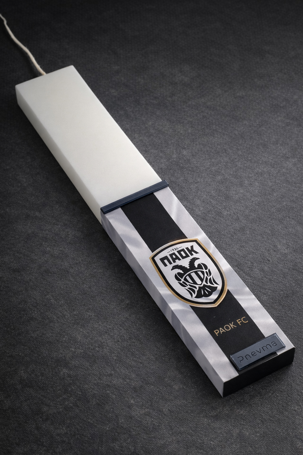Ασπρόμαυρη σύνθεση με έμφαση στο έμβλημα. Εκτυπωμένη πασχαλινή λαμπάδα 25×4.5 cm με ρίγες και κεντρικό σήμα | καθαρό αποτέλεσμα που ξεχωρίζει χωρίς υπερβολή. Ιδανική επιλογή για πασχαλινό δώρο με κλασικό χαρακτήρα.