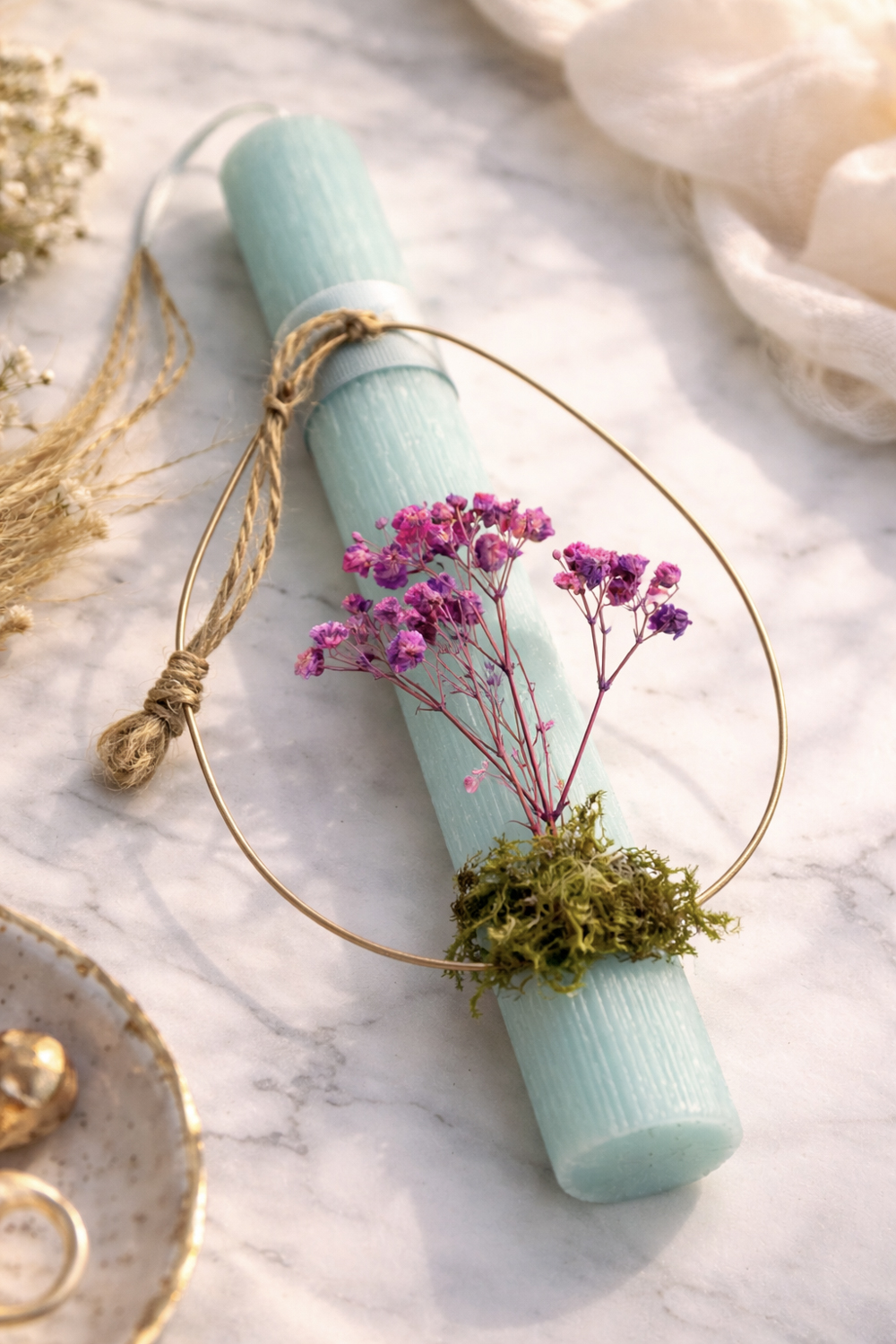 Λαμπάδα σε σιέλ τόνο με ραβδωτή υφή, δεμένη με σπάγκο και διακοσμημένη με μωβ αποξηραμένα άνθη, moss και χρυσό οβάλ στεφάνι. Δίνει αίσθηση άνοιξης και φρεσκάδας | ιδανικό πασχαλινό δώρο με modern boho αισθητική.