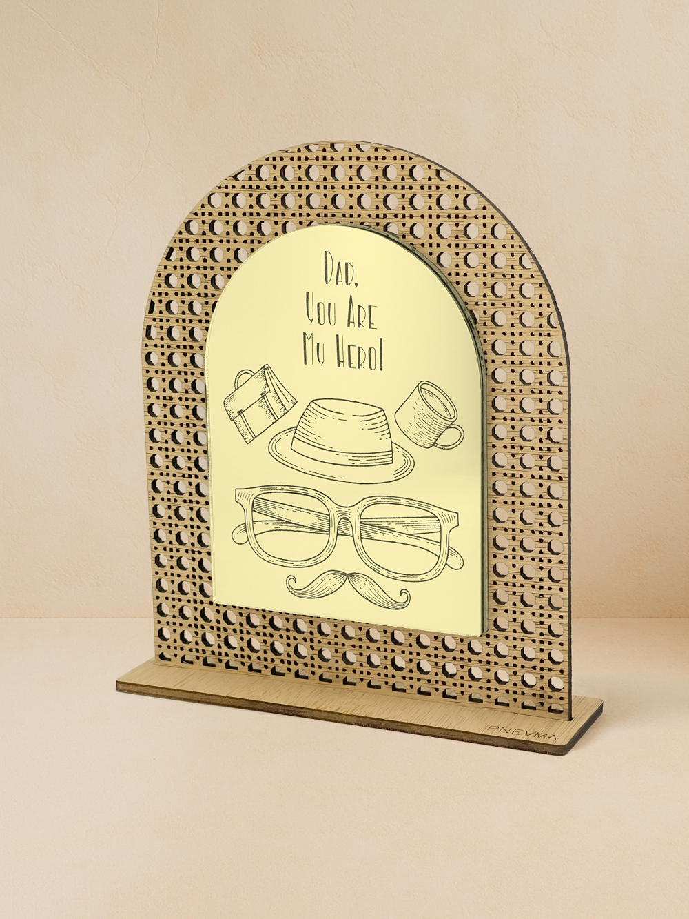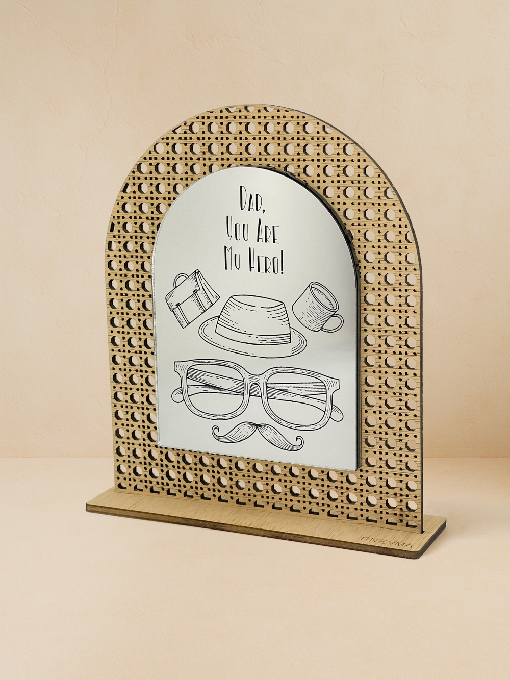 Κάθε φορά που χρειάζεσαι ήρωα, ο μπαμπάς είναι ήδη εκεί. Το διακοσμητικό «Ήρωας Μπαμπάς» παντρεύει το φυσικό ξύλο ilomba, κομμένο με laser σε κομψό μοτίβο rattan, με καθρέπτη χρυσό, ροζ χρυσό ή ασημί. Πάνω του χαράσσεται η φράση «Dad, you are my hero!» πλαισιωμένη από ρετρό σύμβολα ανδρικής κομψότητας. Η θερμή υφή του ξύλου ισορροπεί με τη μεταλλική λάμψη του καθρέφτη, δημιουργώντας ένα μίνιμαλ statement που θα φωτίσει κάθε γραφείο ή ράφι. Χειροποίητο, φτιαγμένο αποκλειστικά στο εργαστήριο Pnevma, προσφέρεται σε προσεγμένη συσκευασία, έτοιμο να εκφράσει την πιο ουσιαστική ευχαριστία για την Ημέρα του Πατέρα ή για κάθε στιγμή που θες να του θυμίσεις ότι είναι ο δικός σου σούπερ ήρωας.