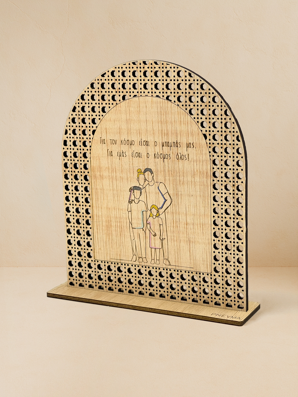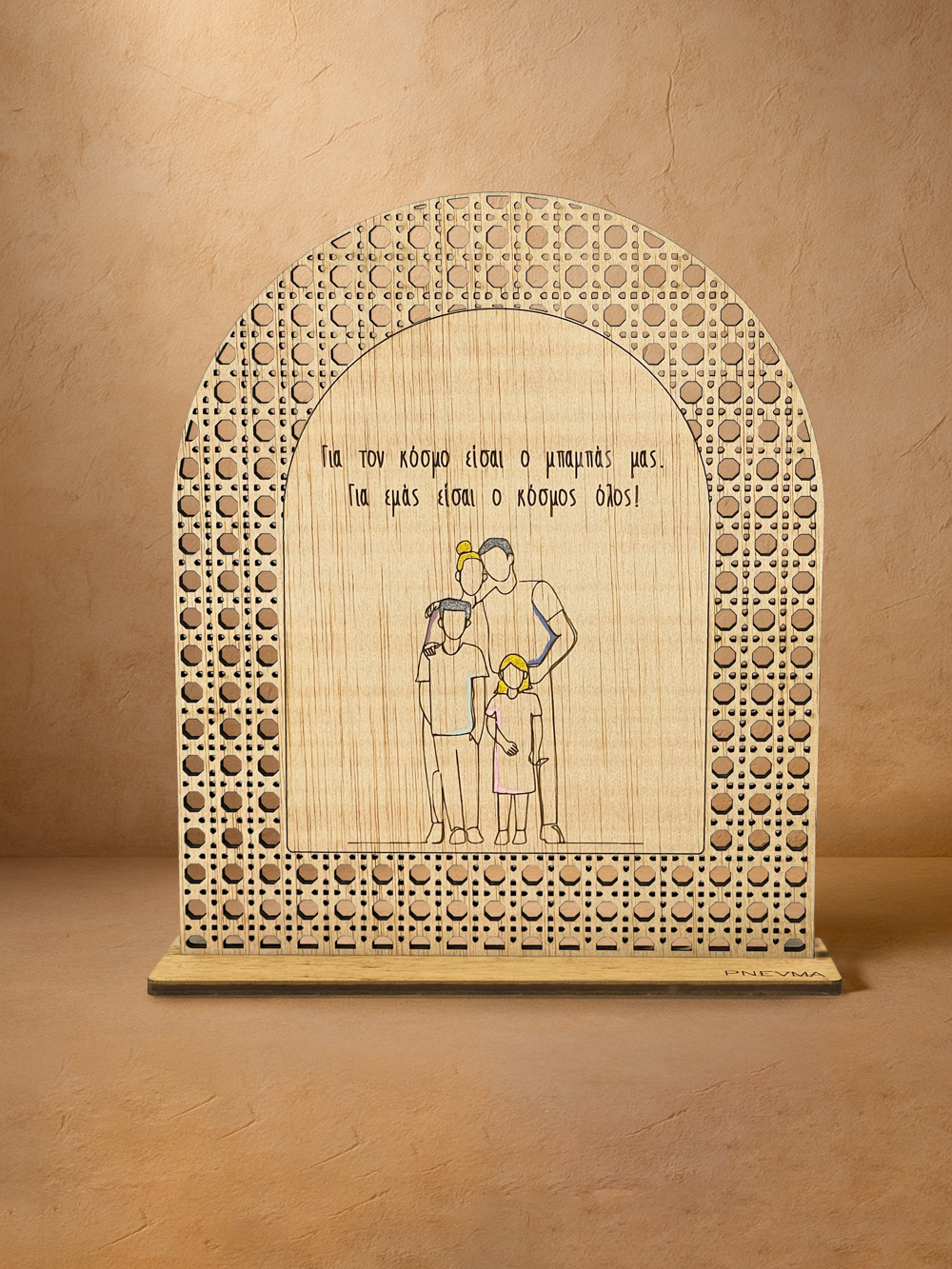 Κάποιοι μπαμπάδες δίνουν συμβουλές, ο δικός σου διδάσκει στυλ. Το «Μπαμπάς με  Στυλ» ενώνει το φυσικό ξύλο ilomba με το μοτίβο rattan. Η λέξη «Μπαμπάς» πλαισιώνεται από ρετρό σκίτσα καπέλου, γυαλιών και μουστακιού, δημιουργώντας ένα παιχνιδιάρικα κομψό hommage στον πατέρα‑πρότυπο. Χειροποίητη δημιουργία Pnevma που φωτίζει γραφείο ή ράφι και γίνεται καθημερινή υπενθύμιση αγάπης.