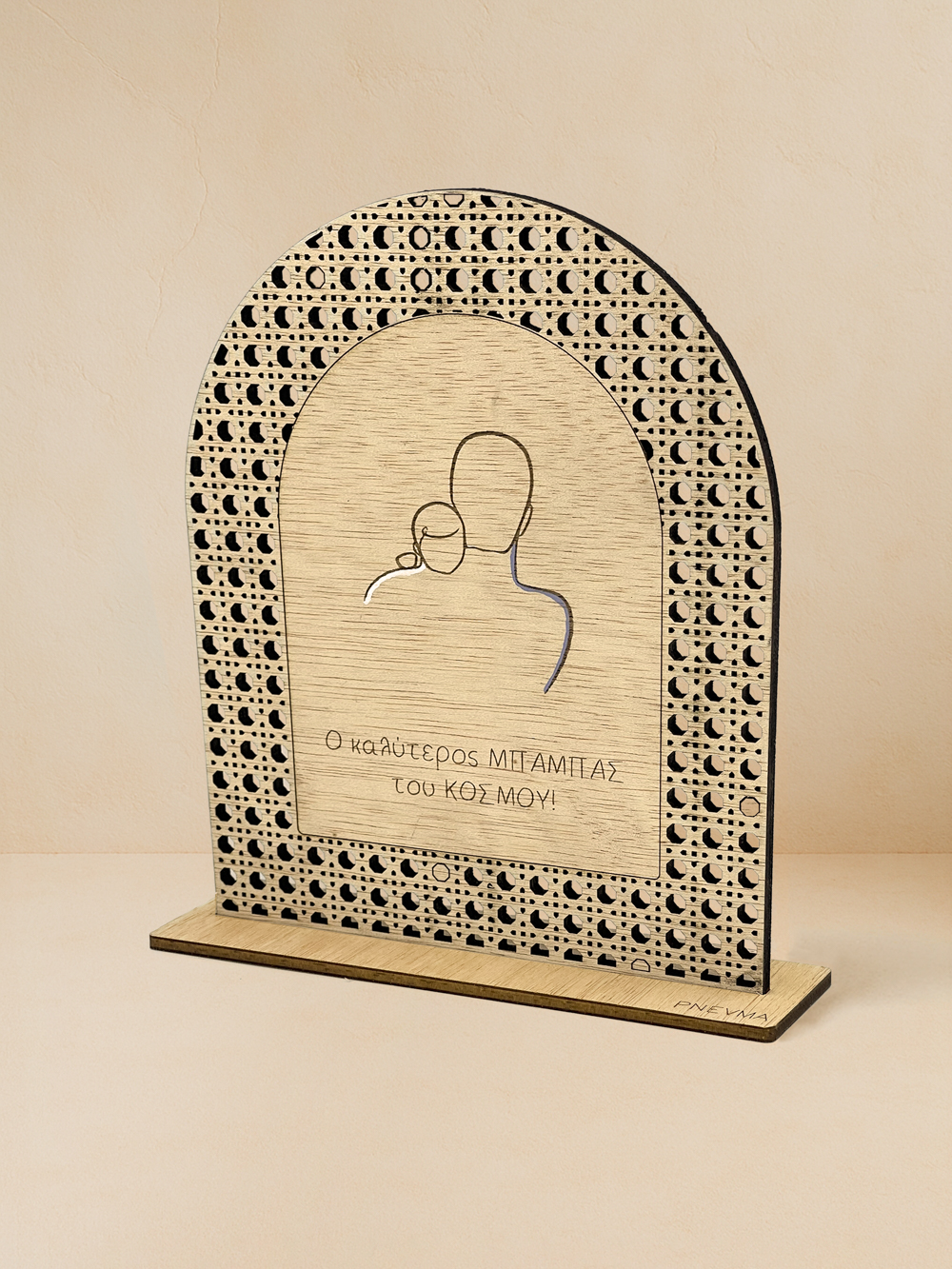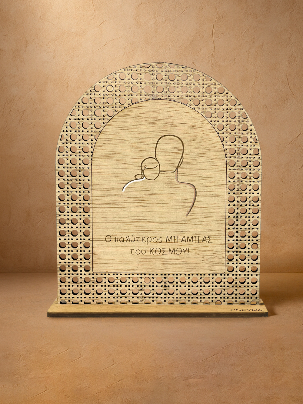 Για τον μπαμπά που κρατά τον κόσμο σου όρθιο, ένα κομψό rattan διακοσμητικό αποτυπώνει τον δεσμό πατέρα-παιδιού με μια μεγάλη αγκαλιά. Από φυσικό ξύλο ilomba, κομμένο με laser, σε φίνο μοτίβο rattan, όπου χαράσσεται η φράση «Ο καλύτερος μπαμπάς του κόσμου!». Η θερμή υφή του ξύλου δημιουργεί ένα μίνιμαλ statement που φωτίζει κάθε γραφείο ή ράφι. Χειροποίητο, φτιαγμένο στο εργαστήριο Pnevma, φτάνει σε πολυτελή συσκευασία, έτοιμο να εκφράσει ευγνωμοσύνη για την Ημέρα του Πατέρα ή για κάθε στιγμή που θες να πεις «σ’ αγαπώ».