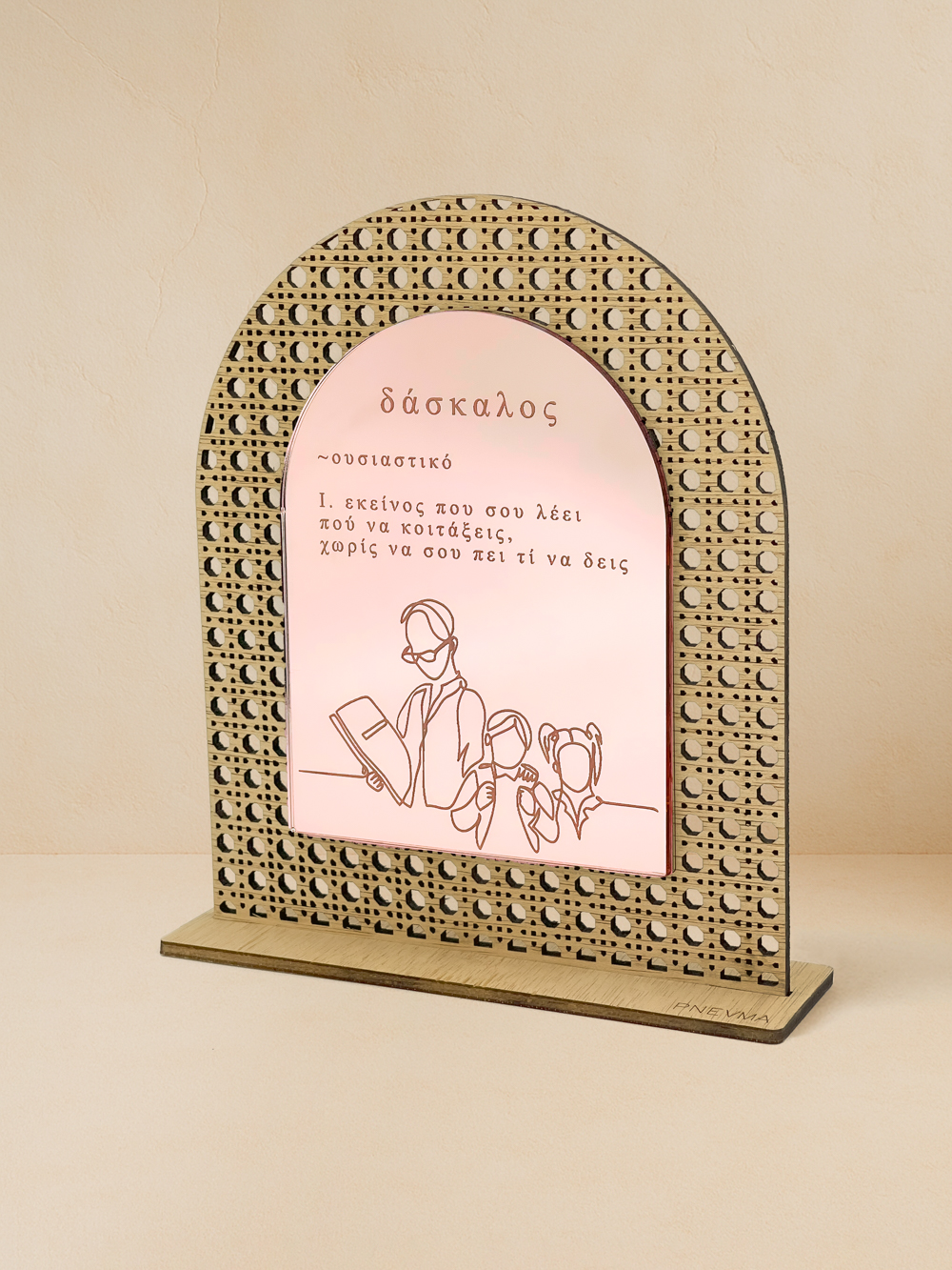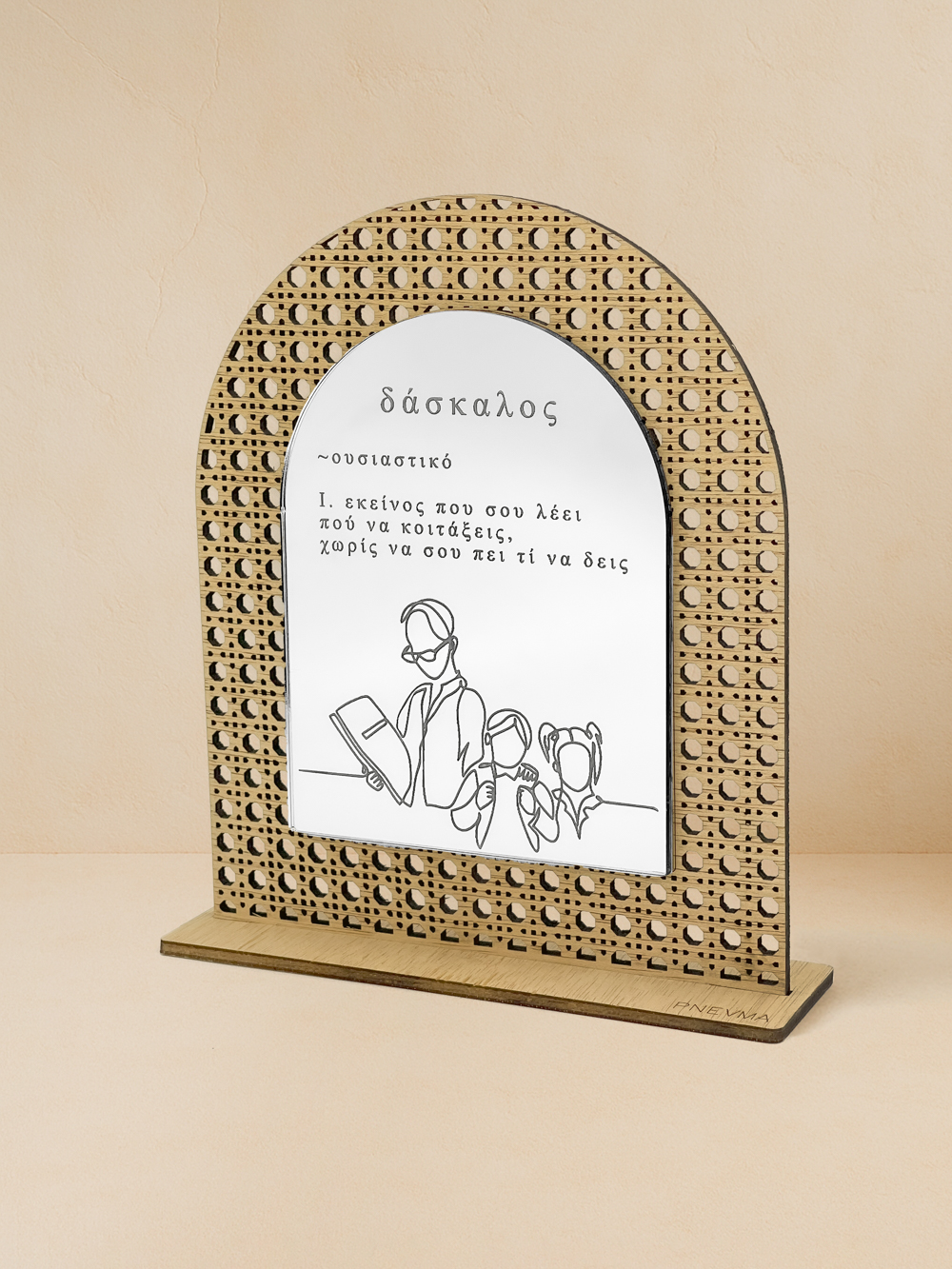 Χάρισε στο δάσκαλο που άνοιξε δρόμους γνώσης ένα χειροποίητο αντικείμενο με προσωπικότητα. Φυσικό ξύλο, κομμένο με laser σε περίτεχνο μοτίβο rattan, αγκαλιάζει τον καθρέπτη σε χρυσό, ροζ χρυσό ή ασημί, όπου χαράσσεται ο «Ορισμός του Δασκάλου». Επιλέγεις ανάμεσα σε τέσσερις χαράξεις για απόλυτα προσωποποιημένο δώρο. Λιτό, κομψό, χειροποίητο από Pnevma, δώρο που μιλάει στην καρδιά.