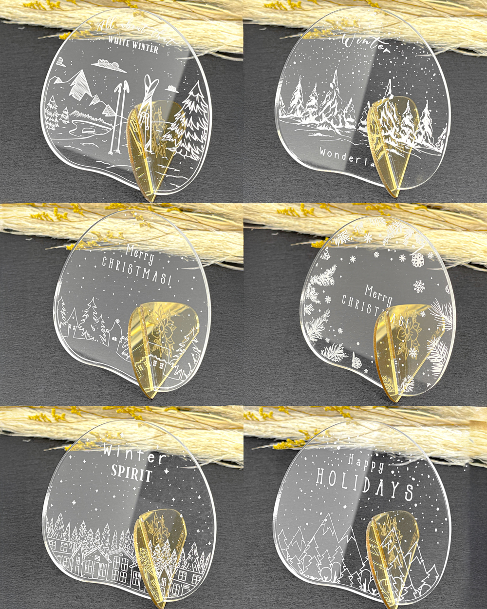 Η συλλογή Aurora φέρνει τη μαγεία των γιορτών σε μια μίνιμαλ, σύγχρονη εκδοχή: διάφανο ακρυλικό με λεπτομερή χάραξη με χιονισμένα τοπία και ευχές. Κάθε κομμάτι στέκεται ελεύθερο, αντανακλώντας το φως και δημιουργώντας ένα πολυτελές εφέ διαφάνειας-χρυσού, ιδανικό για centerpiece, ράφι.