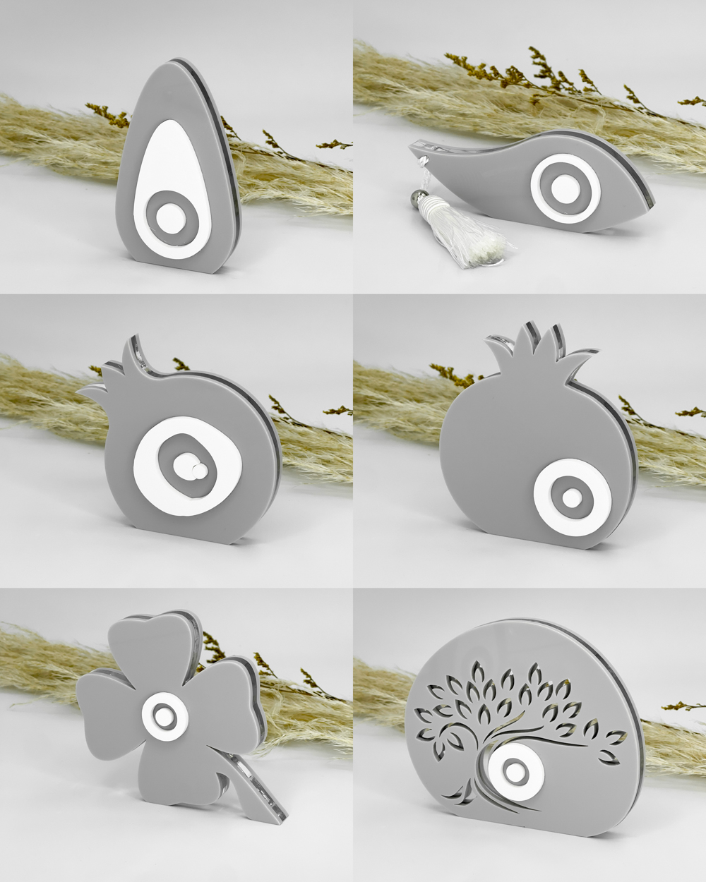 Η Grey Sphere παντρεύει το ψυχρό γκρι ακρυλικό με καθαρές λευκές ομόκεντρες λεπτομέρειες μάτι, δημιουργώντας μια μινιμαλιστική ωδή στην ισορροπία. Ρόδια αφθονίας και προστασίας, τριφύλλια τύχης, δέντρο αρμονίας, σταγόνα και μάτι ηρεμίας μεταφράζονται σε αφαιρετικά γούρια με απαλή σατινέ υφή και γεωμετρική ακρίβεια. Η ουδέτερη παλέτα φωτίζει κάθε χώρο με διακριτική κομψότητα, ενώ τα σύμβολα καλής ενέργειας προσθέτουν μια σύγχρονη, Zen-ελληνική αύρα.