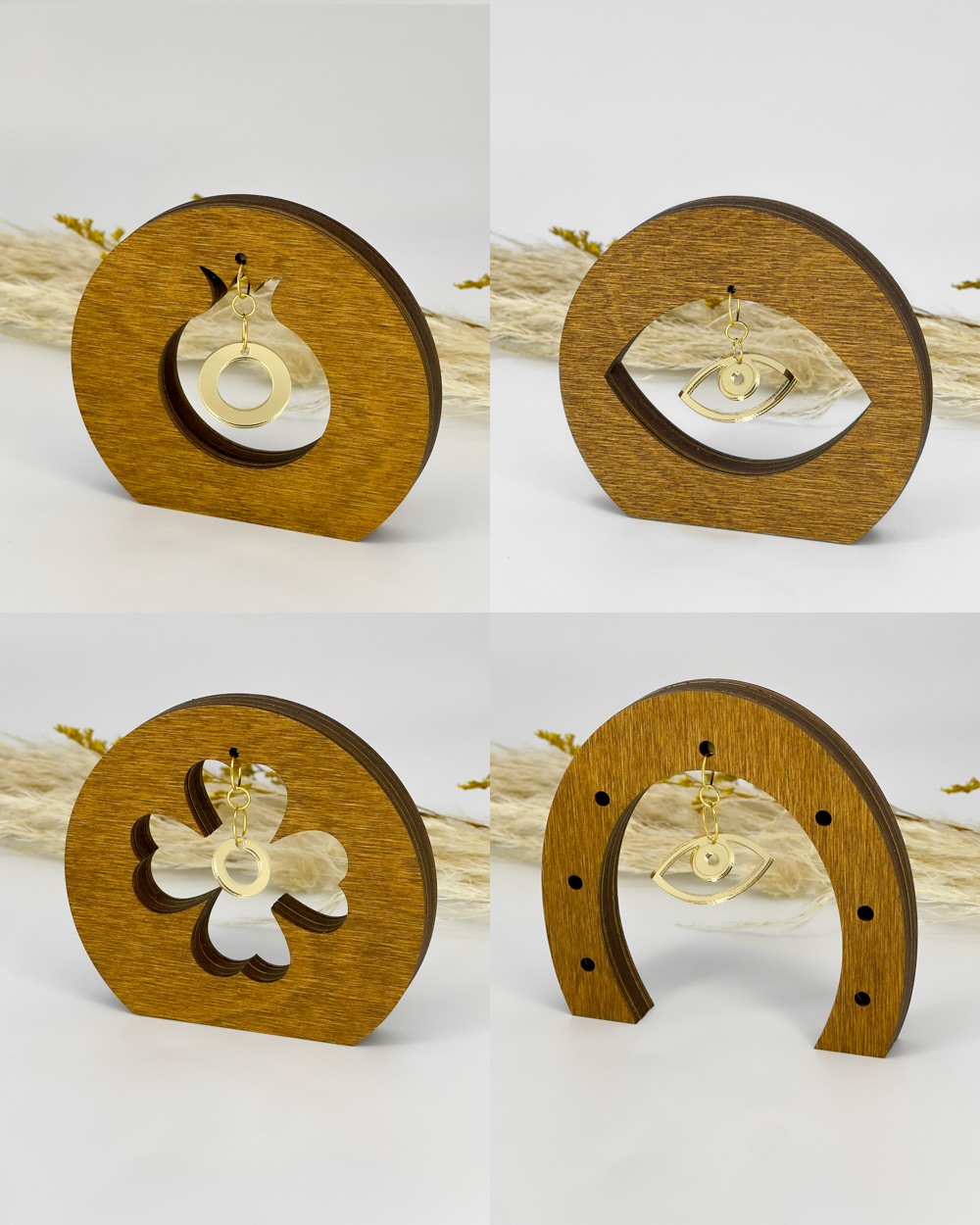 Η Συλλογή Teak Elegance αναδεικνύει το κοντραπλακέ σημύδας σε απόχρωση τικ, συνδυάζοντάς το με «αιωρούμενες» λεπτομέρειες από χρυσό καθρέπτη. Το πέταλο, το μάτι, το τριφύλλι και το ρόδι αποκτούν μίνιμαλ boho-scandi φόρμα, φέρνοντας στον χώρο σας φυσική υφή ξύλου, γήινες θερμές νότες και εκλεπτυσμένα σύμβολα καλής τύχης για κομψή ελληνική αύρα.