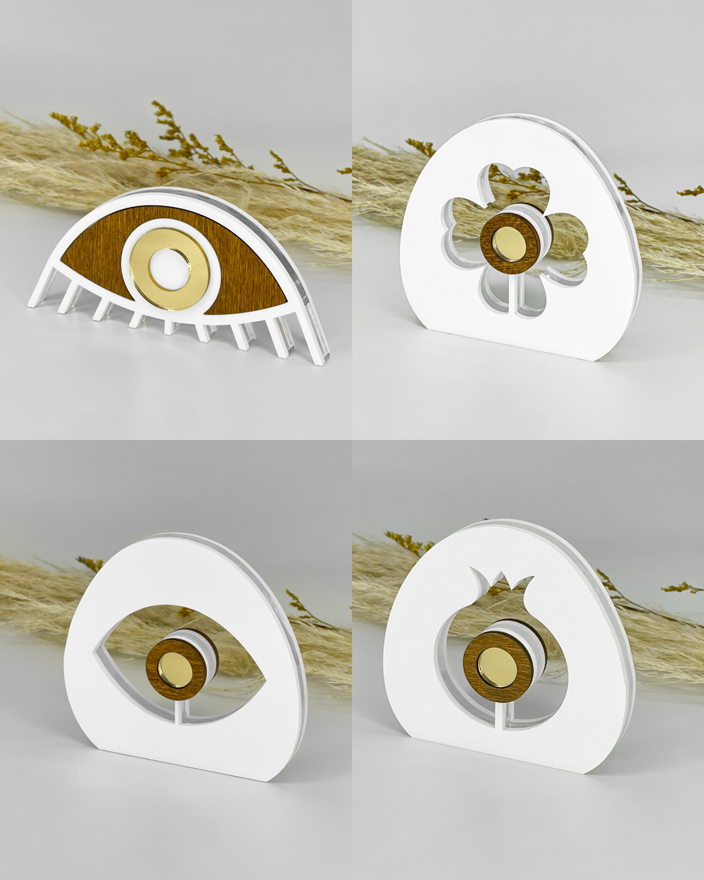 Η Συλλογή White Mystique συνδυάζει λευκό plexiglass και ζεστή όψη teak και χρυσαφί καθρέπτη σε γούρια μάτι, τύχη, ρόδι και ασπίδα, χαρίζοντας minimal προστασία και διαχρονική κομψότητα σε κάθε χώρο.